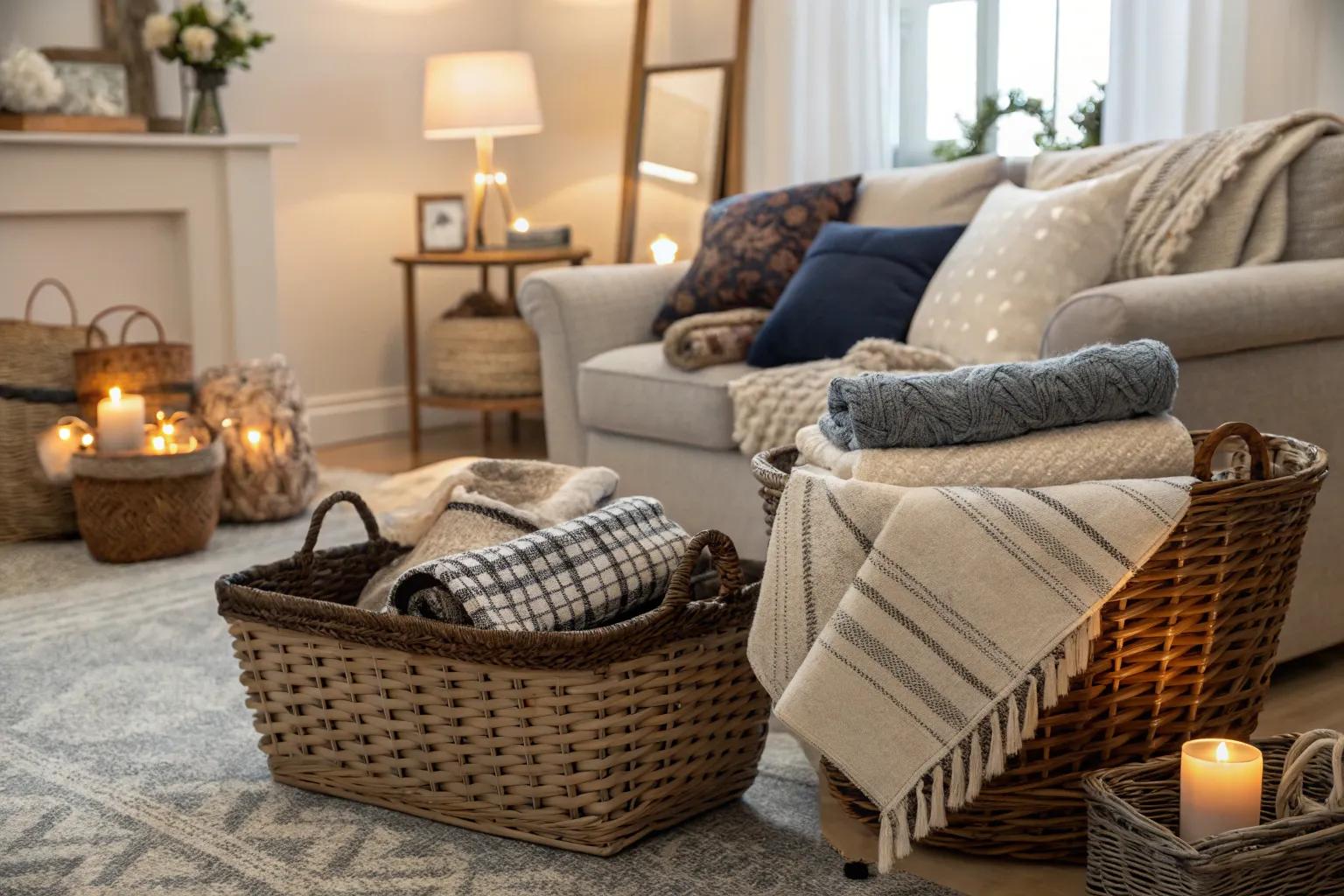 Embrace the spirit of each season by curating baskets that reflect its unique charm. For autumn, include cozy throws, pumpkin spice-scented candles, and decorative fall leaves to create a warm ambiance.