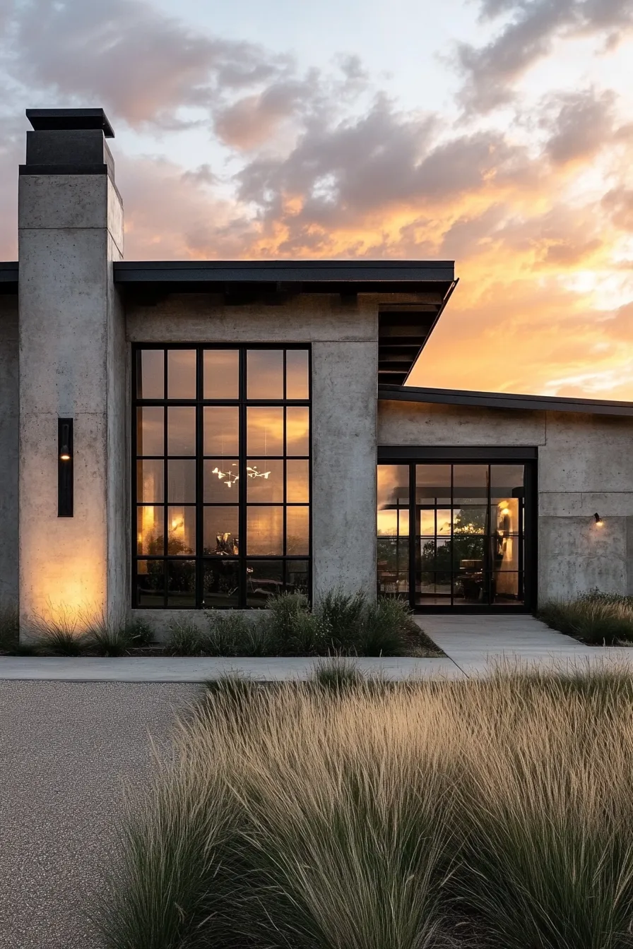 The combination of raw concrete and rustic ranch features creates a striking barndominium exterior that commands attention while honoring its agricultural heritage. Towering concrete walls with natural gray patinas are softened by sunset’s warm glow, complemented by large black-framed windows that resemble contemporary art pieces. Weathered steel accents add industrial charm, and native grasses sway gently around the structure, blending architectural strength with natural beauty. Thoughtful lighting enhances the textured surfaces, casting dramatic shadows as night falls.