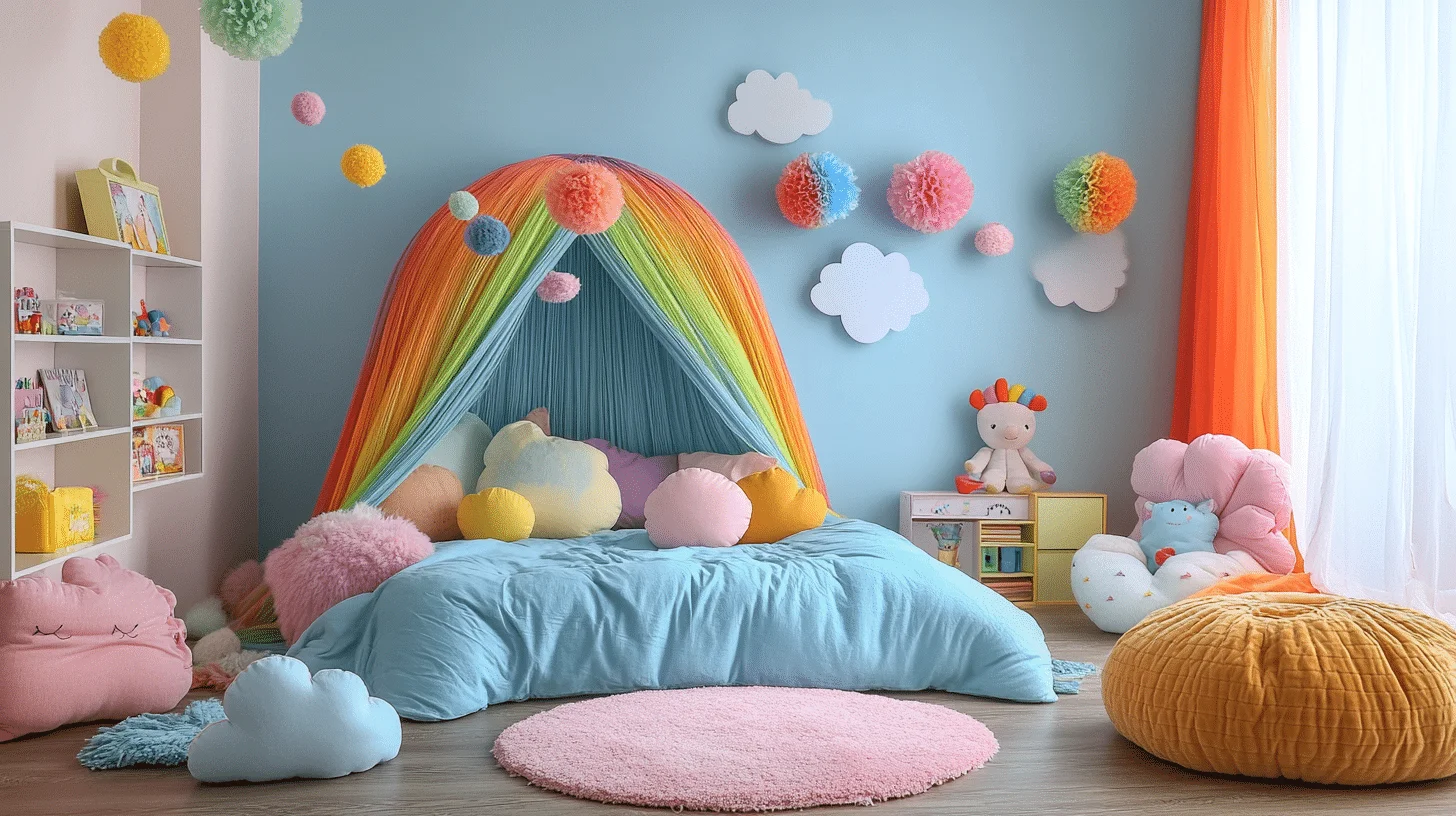 Inject joy into your child’s room with a boho rainbow theme featuring bright colors and budget-friendly cloud decorations. Use rainbow-patterned bedding and simple wall art from discount stores to create a cheerful environment. Add whimsy with DIY cloud mobiles and vibrant fabrics.