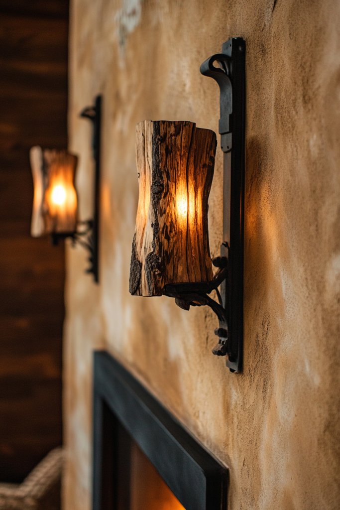 Envision hand-finished wooden sconces with a weathered patina paired with sturdy iron brackets. The interplay of wood grain and metal creates a tactile, layered effect, casting soft shadows that enhance the room’s warmth. These fixtures complement shiplap walls, exposed beams, and stone fireplaces beautifully.