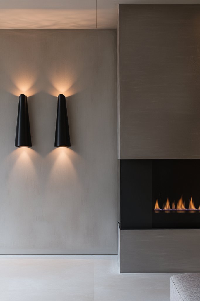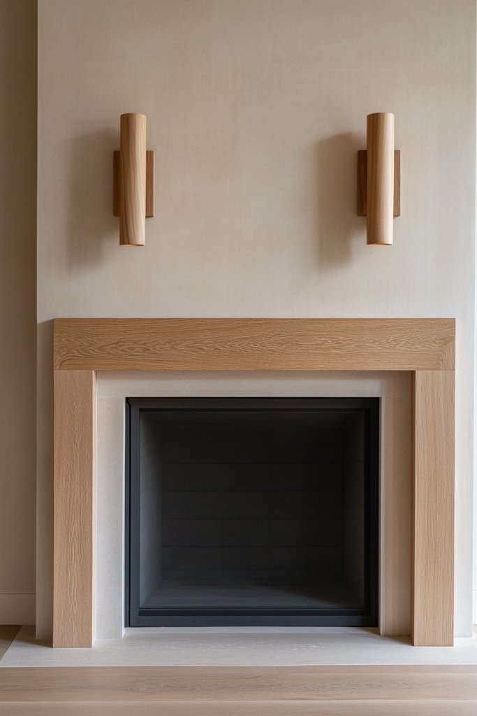 Imagine slender wooden sconces with smooth edges, mounted beside your fireplace. The warm light diffuses gently through simple shades, enhancing the room’s calm and inviting atmosphere.