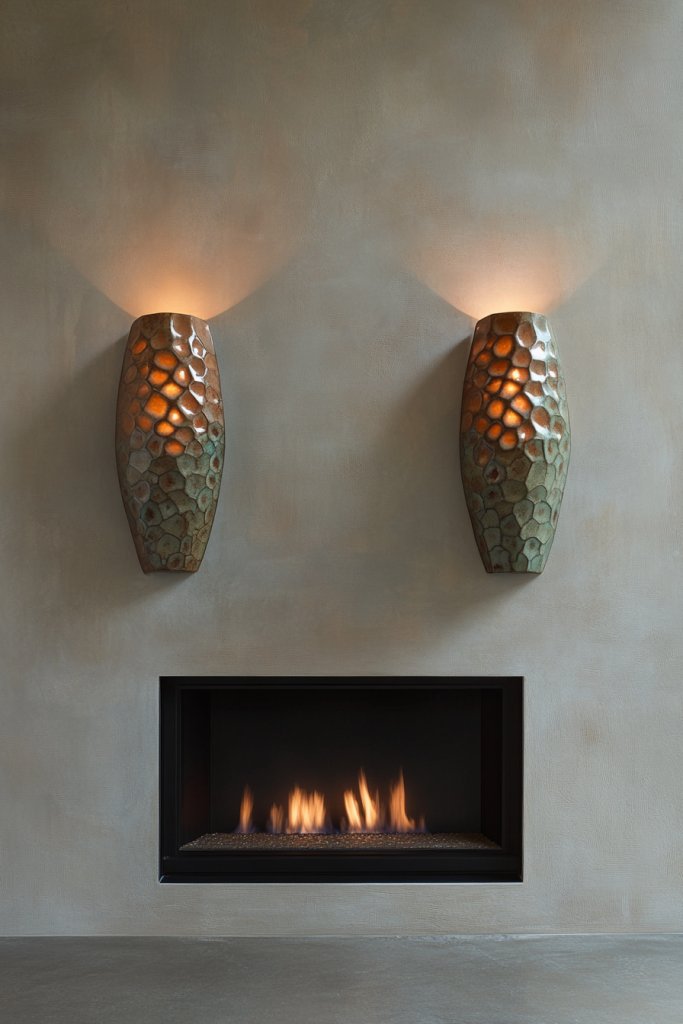 If you desire lighting that doubles as art, ceramic sconces with textured glazes offer handcrafted beauty and tactile interest. Their unique finishes create captivating shadows and depth, turning your fireplace into a gallery-worthy feature.