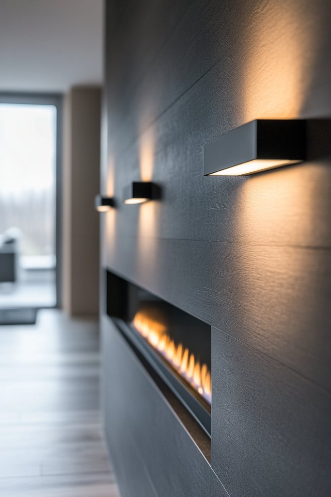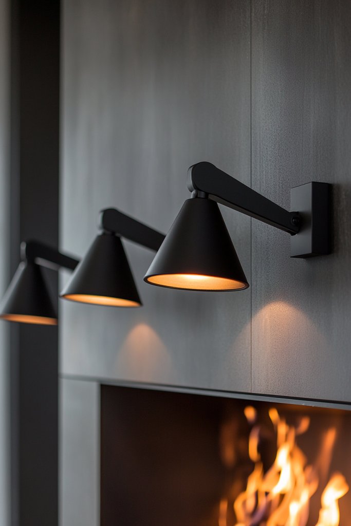 Imagine a matte black metal sconce with sharp, linear contours mounted adjacent to your fireplace. The smooth finish softly reflects light, creating a cozy atmosphere that complements neutral palettes and adds a contemporary flair. This contrast between dark metal and warm illumination fosters a serene yet stylish environment.