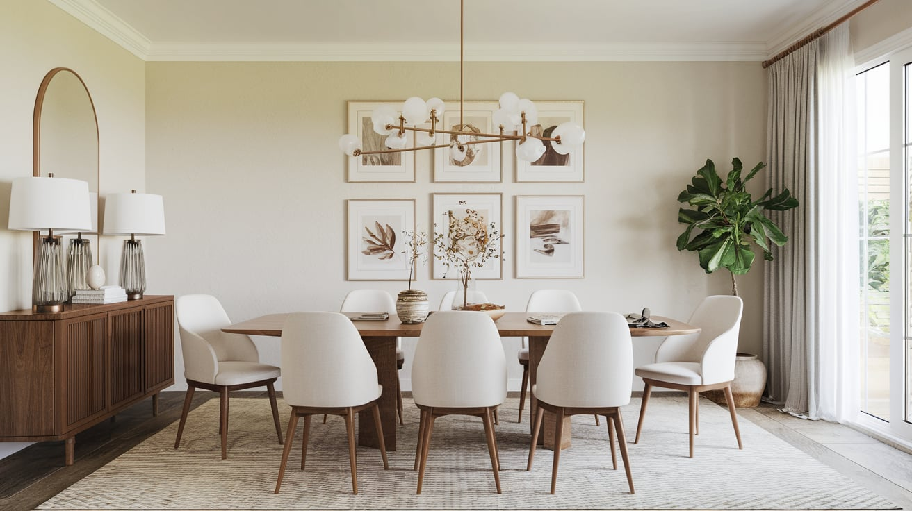 Adding plants such as snake plants, pothos, or succulents not only purify the air but also inject vitality into your dining space. Consider hanging planters above the table or placing small pots on windowsills to contrast beautifully with neutral walls.