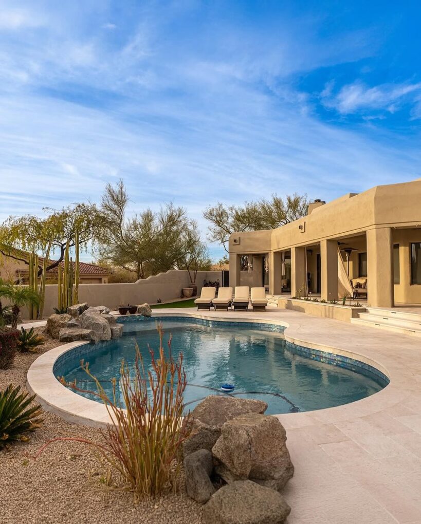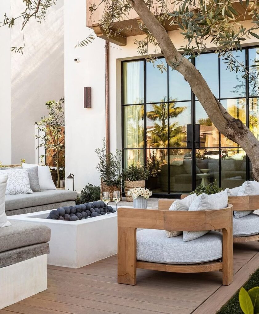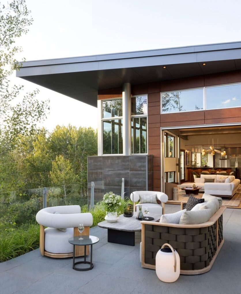 Combining sleek modern lines with desert-inspired materials like smooth concrete, gravel, and sculptural succulents, this patio style embraces the natural environment. It’s designed for low maintenance and high style, perfect for sun-drenched climates. The aesthetic is both warm and contemporary, offering a chic outdoor living area that harmonizes with its surroundings.