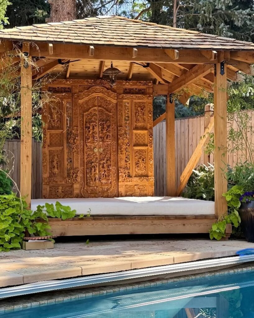 Adding a roofed structure with soft, billowing curtains creates a private, shaded retreat that feels like an extension of your indoor living space. The curtains provide adjustable privacy and light control, while their gentle movement adds a romantic touch. This design is perfect for those seeking an elegant yet cozy outdoor lounge area.