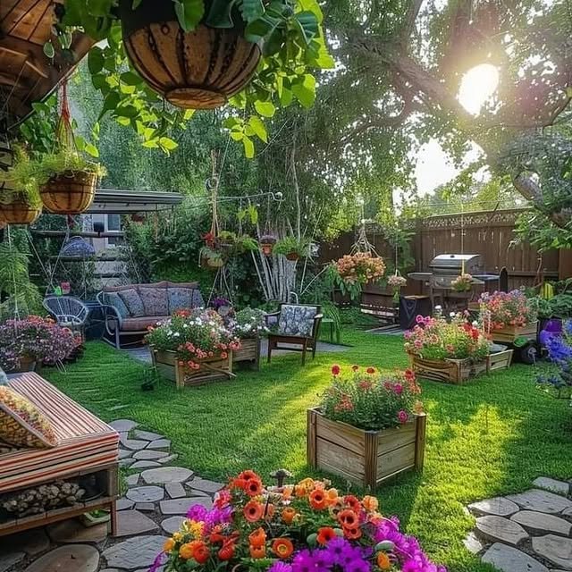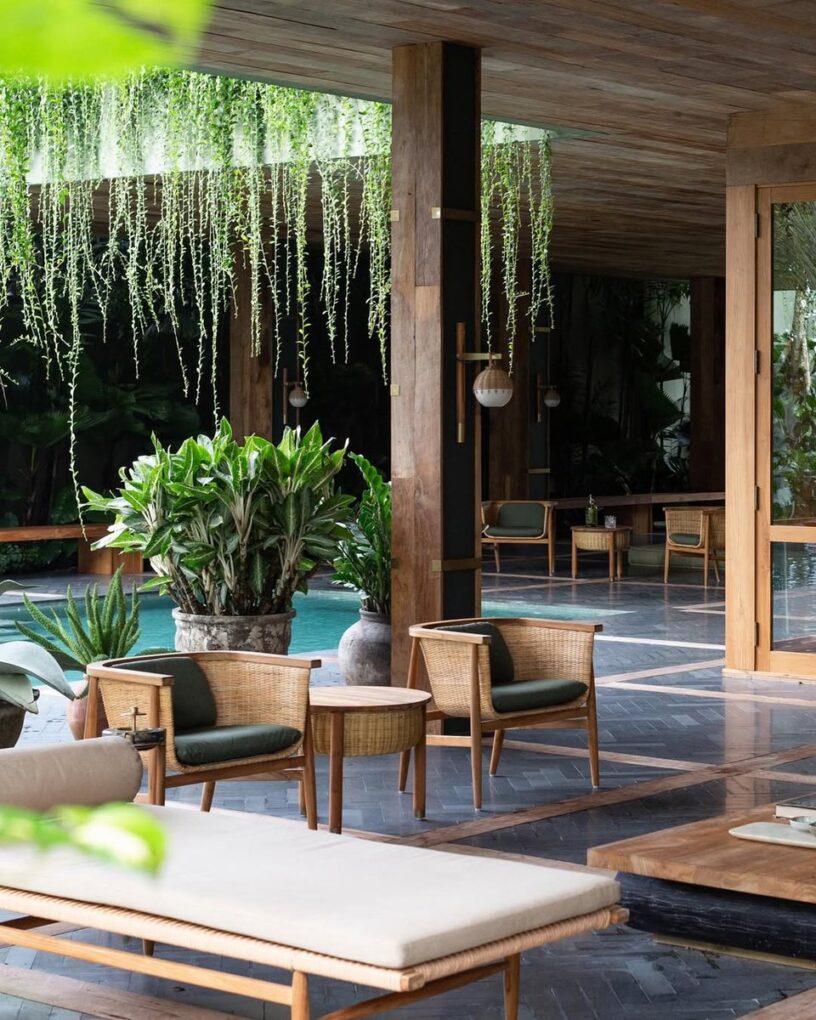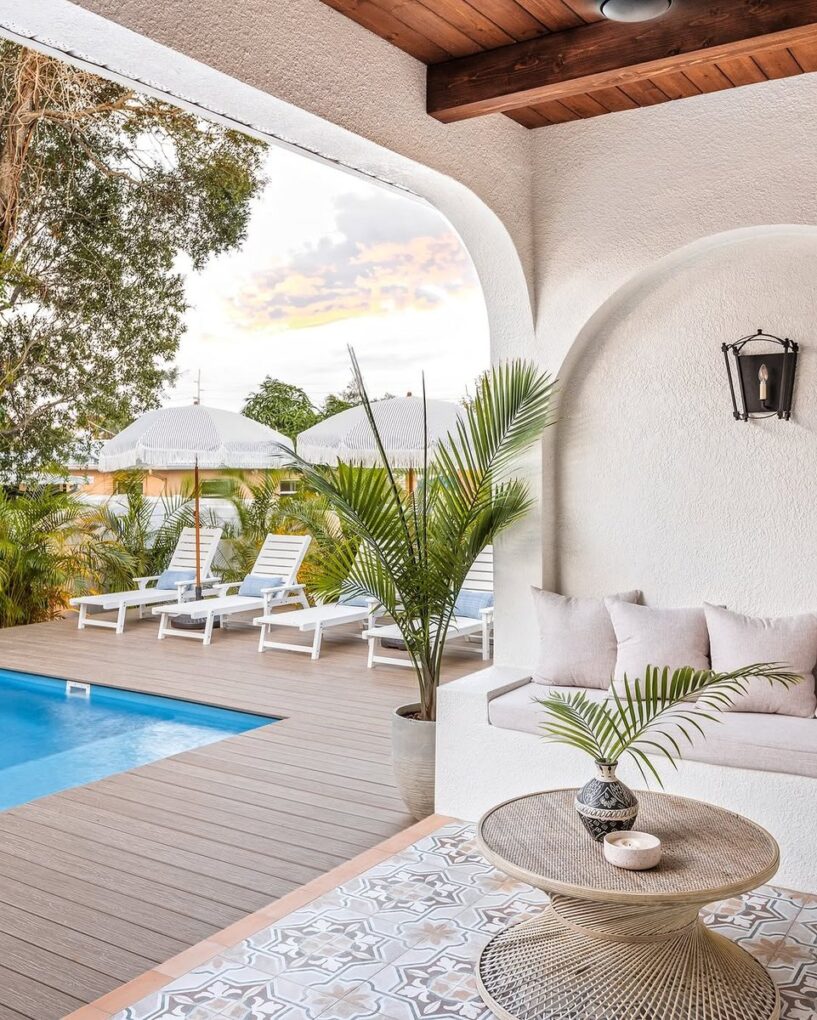 Bring the laid-back vibe of tropical resorts to your backyard with rattan or teak furniture, abundant greenery, and breezy fabrics. Incorporate bold hues and organic shapes to evoke a vacation-like atmosphere. This style encourages relaxation and a connection to nature, perfect for those seeking a sunny, tranquil retreat at home.