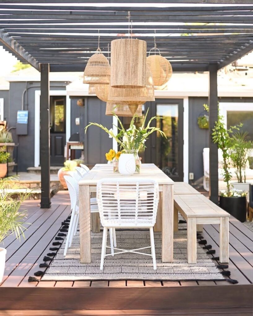 Adding architectural interest and shelter, a pergola-covered dining area defines an outdoor room with open beams that filter sunlight. This structure is perfect for alfresco meals, allowing you to hang string lights or flowing curtains to enhance ambiance. Whether hosting brunches or evening dinners, the pergola creates a stylish and comfortable setting that blends indoor comfort with outdoor freshness.