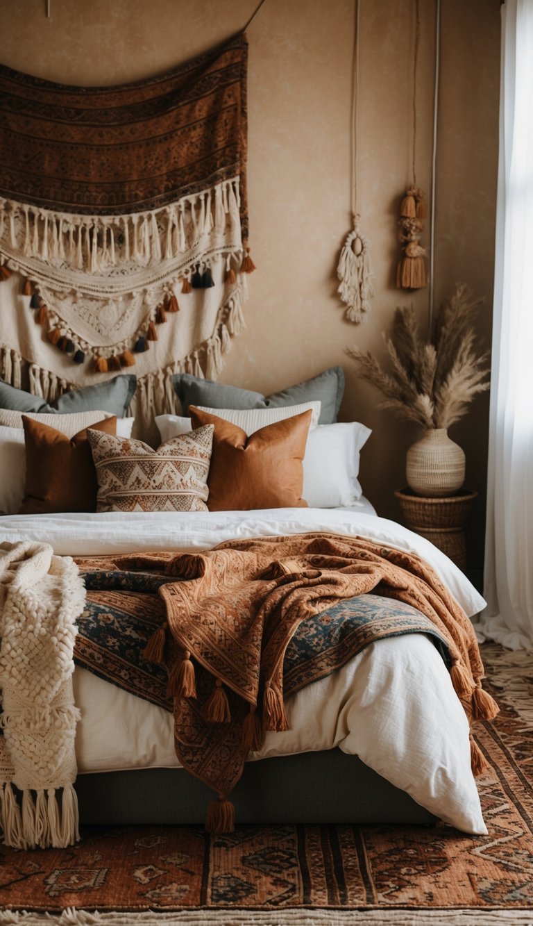 A boho bedroom featuring layered rustic rugs with warm earthy tones, cozy throws, and pillows