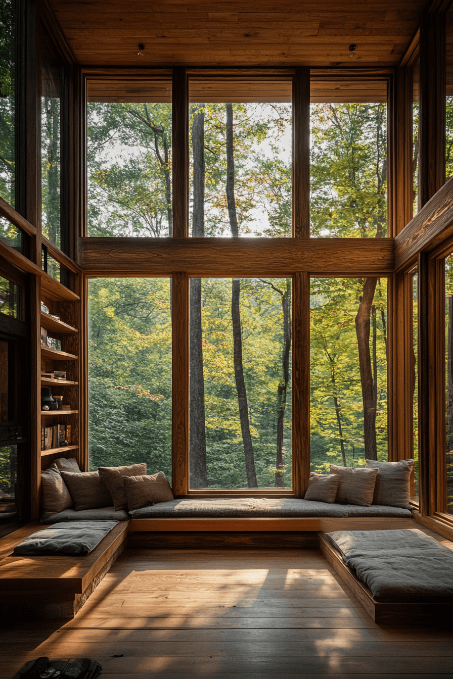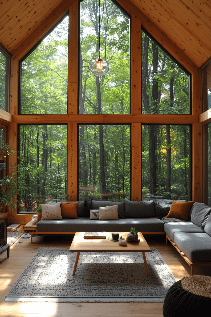 Earthy tones, organic textures, and expansive windows integrate these interiors seamlessly with their forest surroundings. The result is a tranquil haven that feels like an extension of the landscape, perfect for those seeking deep immersion in nature.