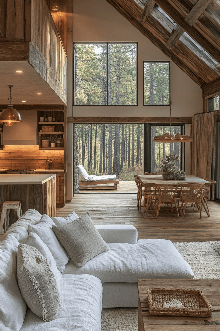 Neutral palettes, uncluttered spaces, and sleek lines define these serene cabins. Expansive windows invite the surrounding woodland indoors, blurring boundaries and fostering a tranquil atmosphere. This design is ideal for those seeking simplicity and mental clarity in their retreat.