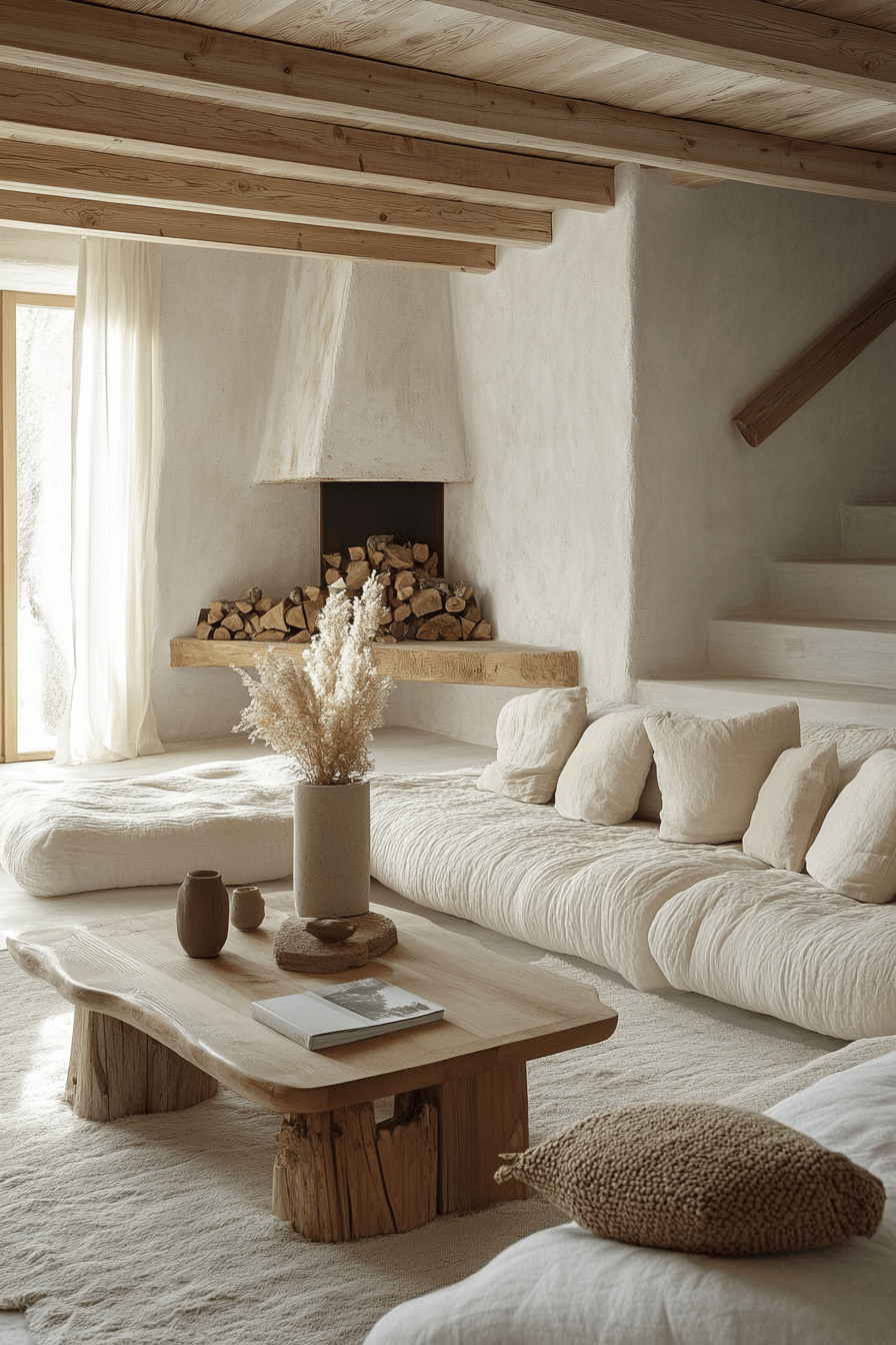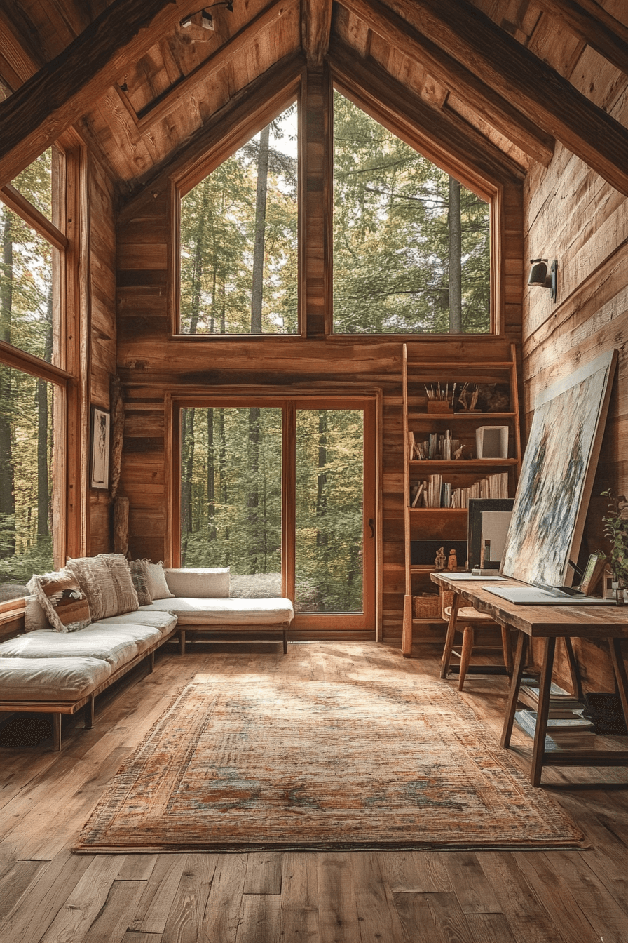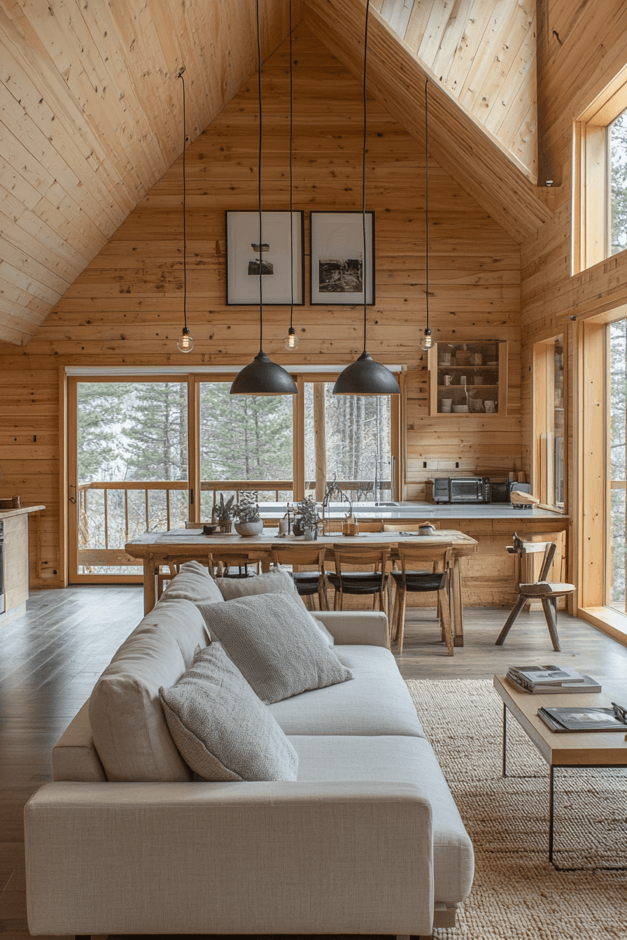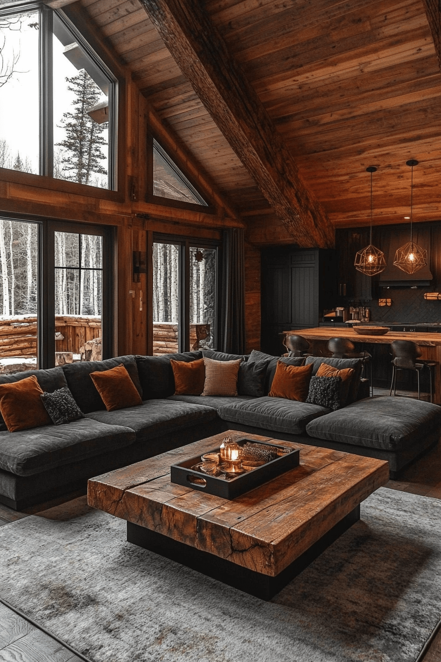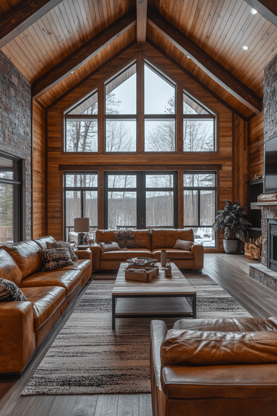 Timber-clad walls, exposed beams, and wooden floors envelop these interiors in warmth and comfort. The natural grain and texture of wood enrich every surface, making this style a favorite for cozying up during colder seasons.