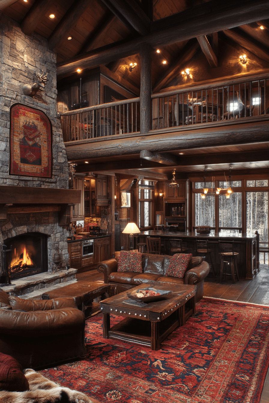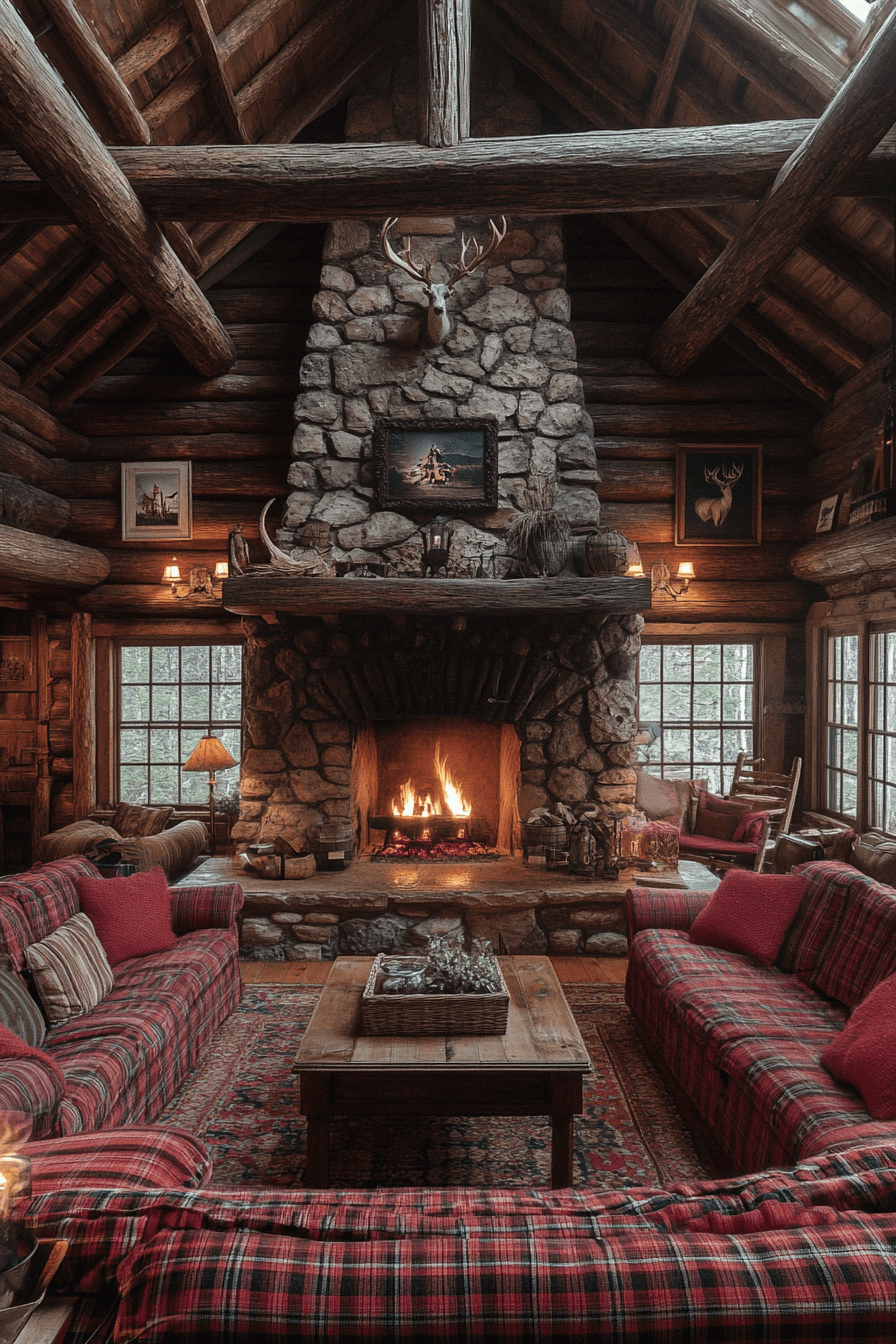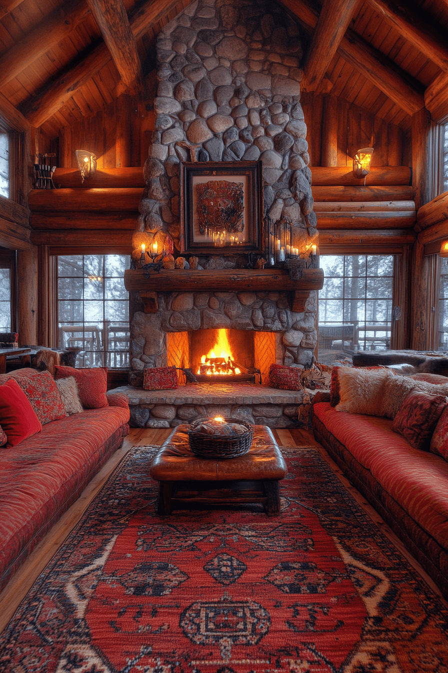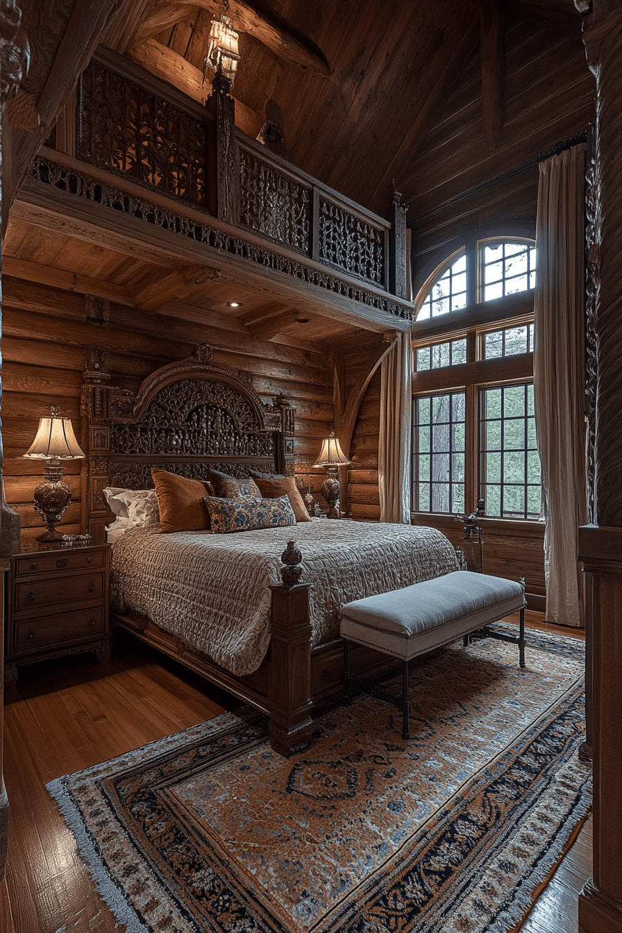 Exposed wooden beams, paneled walls, and artisanal furnishings create a timeless rustic atmosphere. Traditional patterns and textures add warmth and personality, making this style perfect for those who cherish the heritage and authenticity of cabin living.