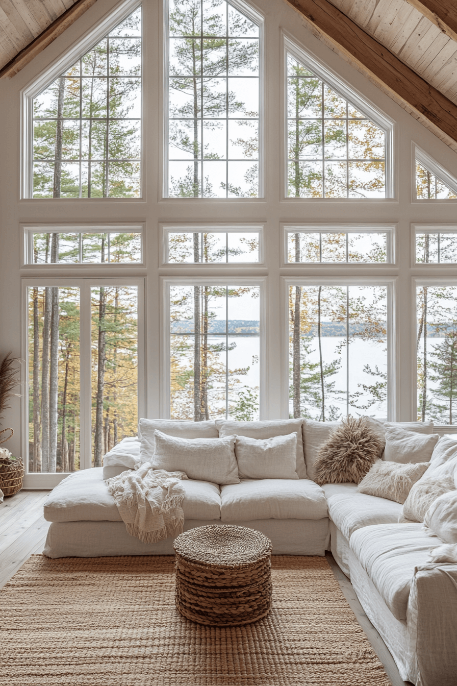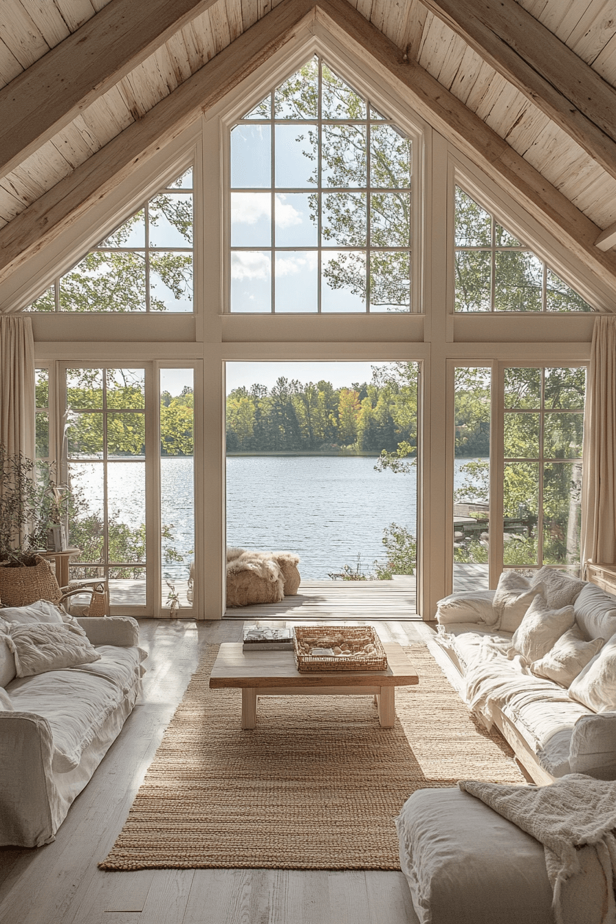 Soft color schemes, open floor plans, and expansive windows frame serene lake views, inviting gentle breezes and peaceful vibes indoors. This design is perfect for those who seek a calming waterside sanctuary.