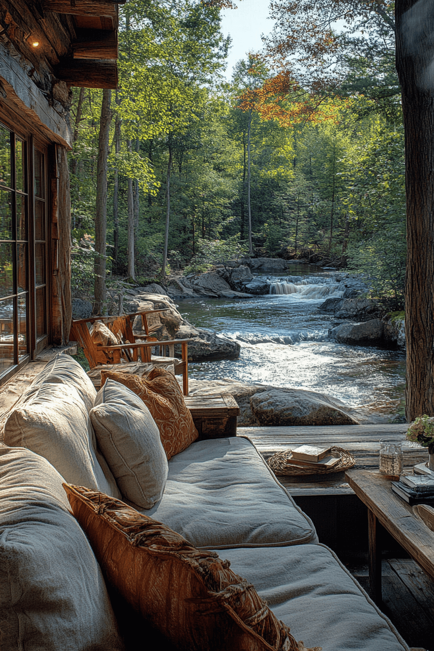 Soft color palettes, natural materials, and flowing layouts echo the gentle movement of a nearby stream. Outdoor seating areas and water views enhance the peaceful vibe, making this an ideal refuge for relaxation.