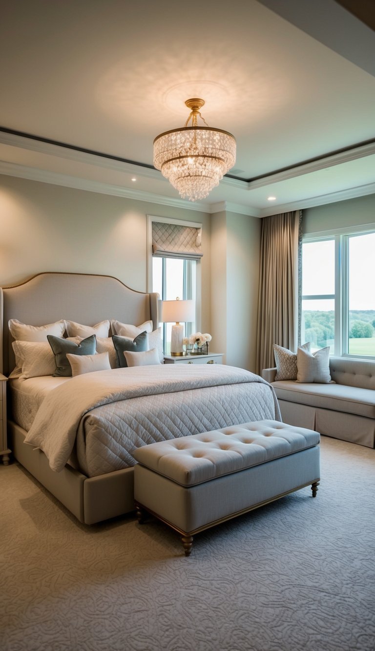 Soft, neutral bedding with textured pillows in a spacious, well-lit master bedroom