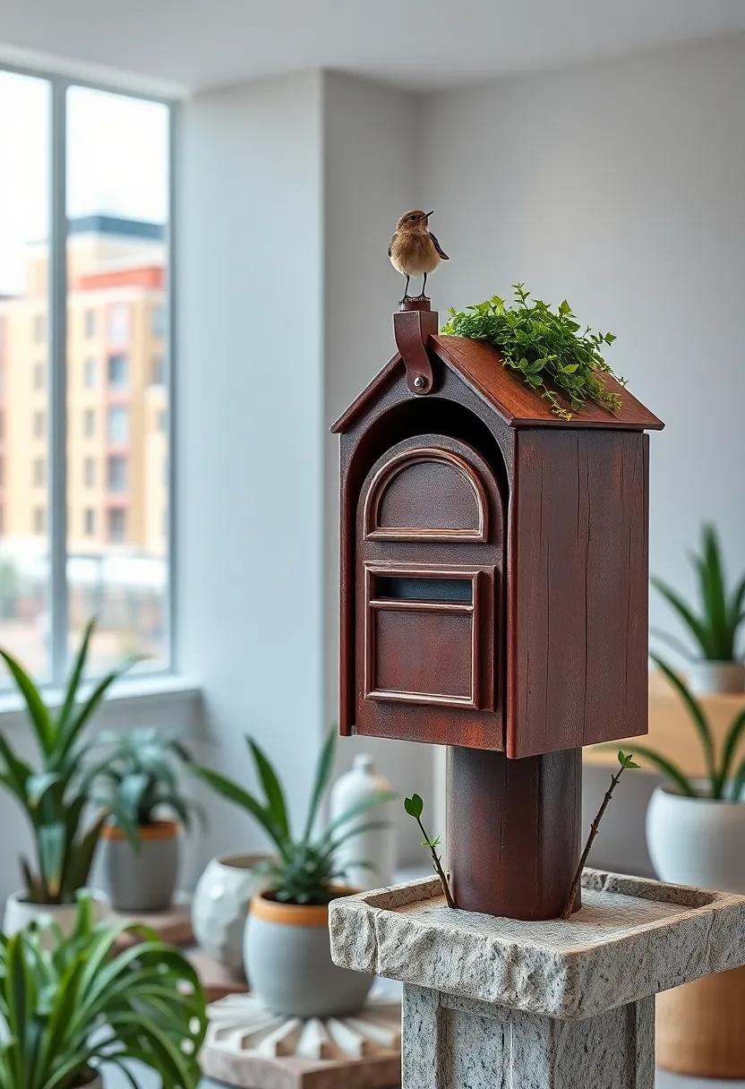 A Charming Bird Perched on the Edge of a Cozy Mailbox Garden Surrounded by Urban Sights
