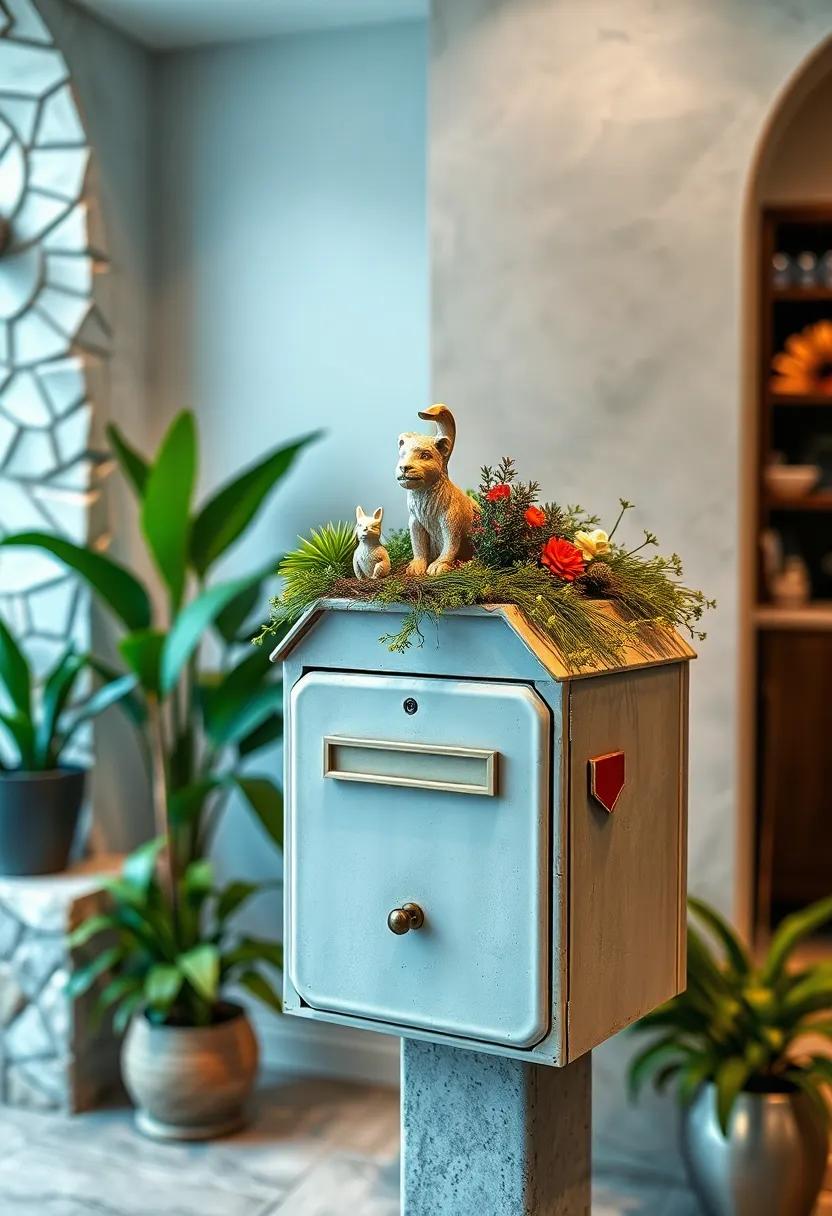 The Whimsical Addition of Miniature Sculptures Nestled Among Plants on a Mailbox Roof