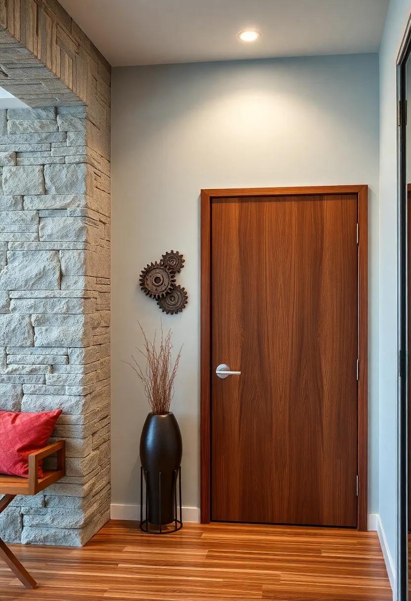 Pairing antique mechanical elements with modern design highlights a captivating contrast that brings depth to any entryway. The tactile allure of vintage gear wall art introduces a sense of history and craftsmanship, perfectly balanced by the warmth and sophistication of a walnut door. The stainless steel push handles inject a subtle industrial vibe, marrying form and function seamlessly. This juxtaposition not only enhances visual interest but also crafts a welcoming gateway that feels both grounded and progressive.