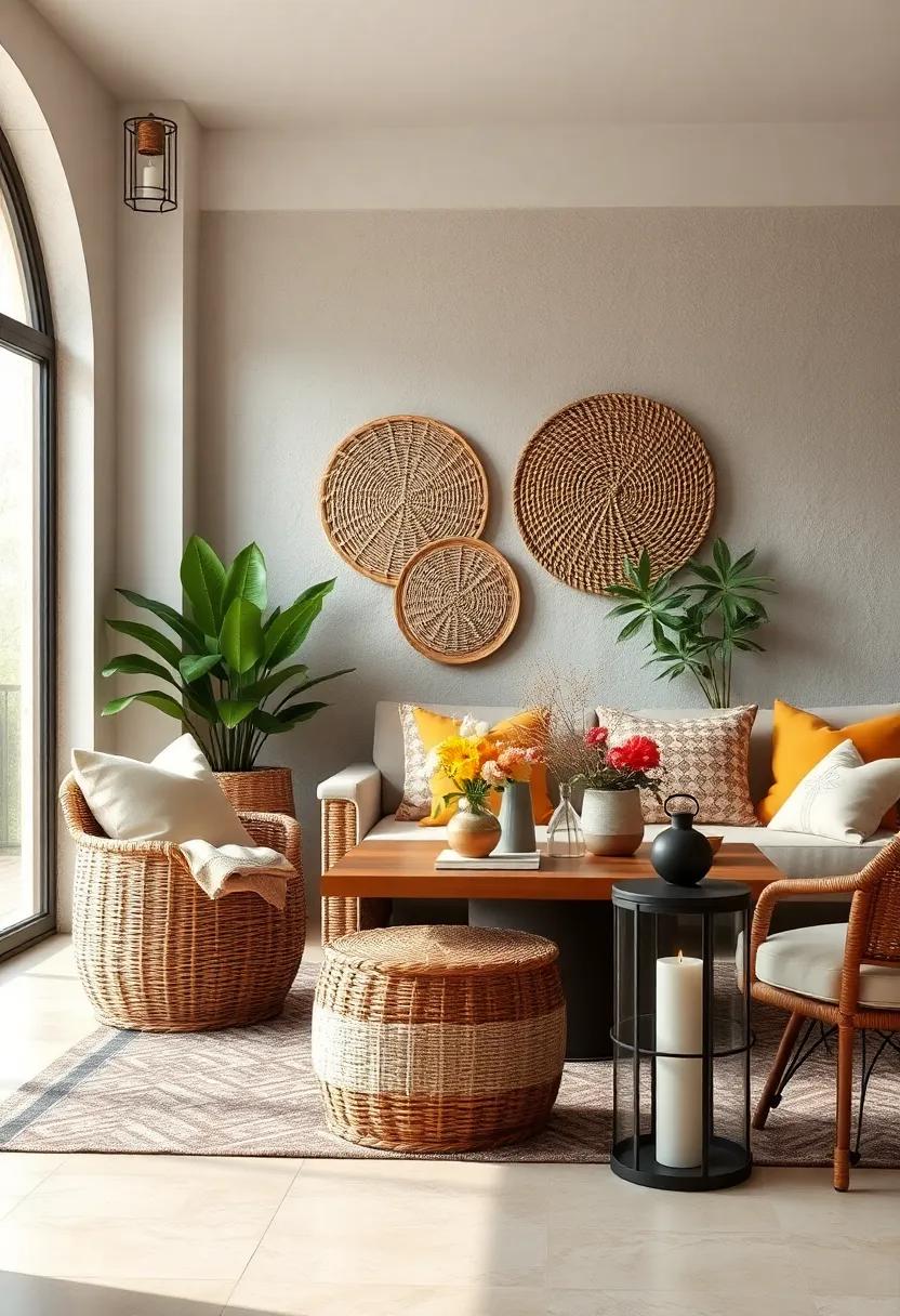 • Contrast Scale: Pair larger wicker baskets as storage solutions with smaller, delicate iron lanterns to create visual interest without clutter.