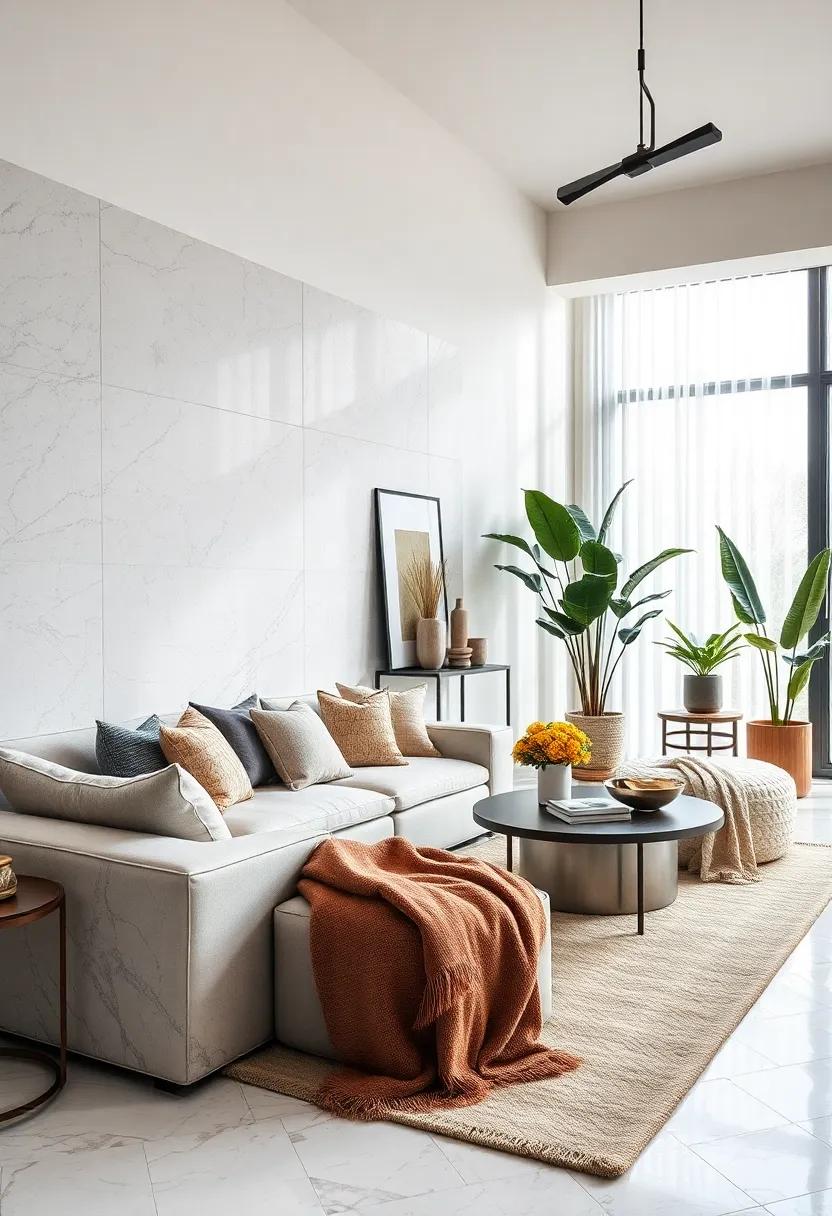 Consider integrating these elements in your decor by layering throws in muted shades like slate gray, ivory, or dusky rose to complement the marble’s natural hues. Enhancing this blend further, try incorporating: