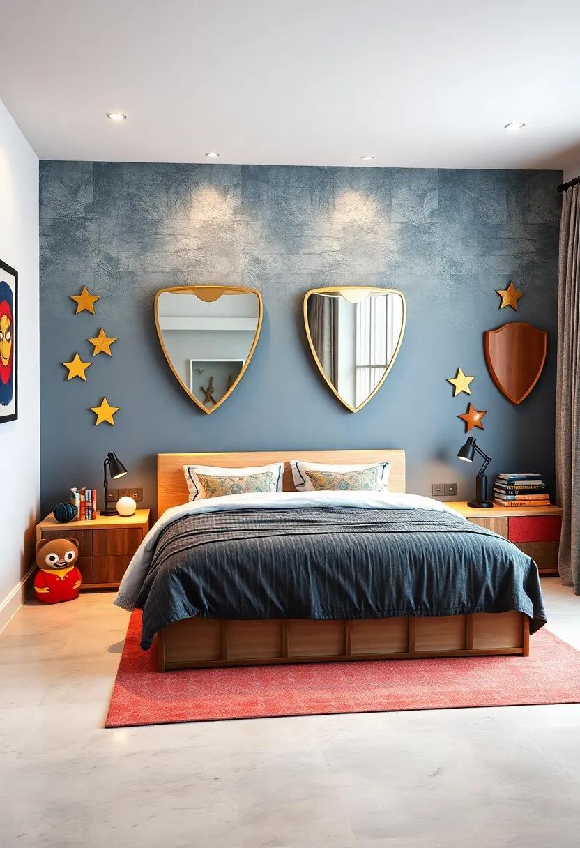 Incorporating mirrors designed as shields and masks brings a dynamic edge to a superhero-themed bedroom that goes beyond mere decoration. These reflective pieces not only amplify natural and artificial light, but also create an illusion of space, making the room feel larger and more vibrant. The unique shapes, inspired by iconic superhero gear, instantly catch the eye and serve as bold focal points on the walls. Placing them strategically near light sources ensures the rooms shimmer with superhero energy, brightening the environment in ways traditional mirrors can’t manage.