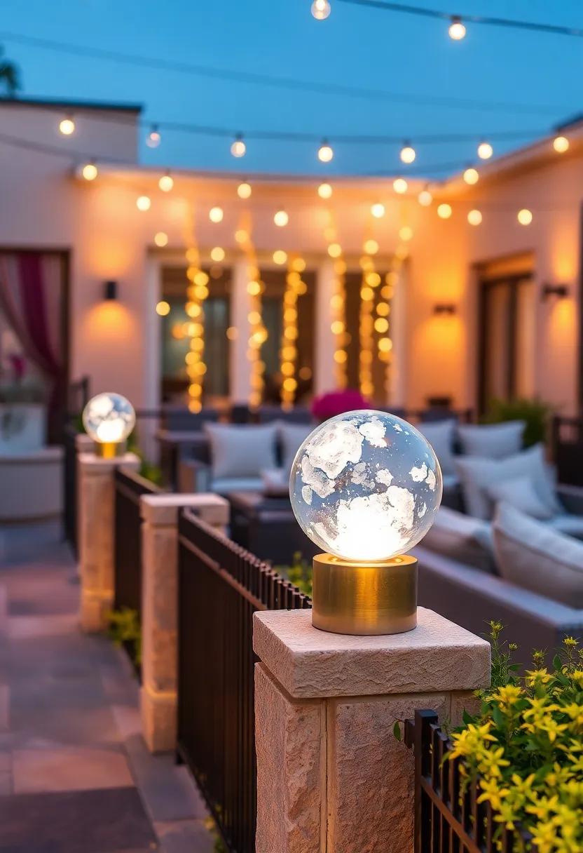 Glowing Crystal Orbs Placed On Fence Caps Creating Ethereal Lighting Effects For Evening Mingling