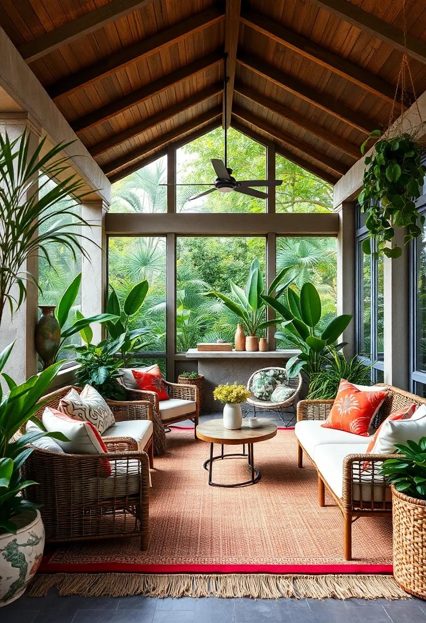 Lush Jungle Inspired Screened Porch Bar Surrounded by Tropical Plants, Woven Furniture, and Natural Fiber Rugs