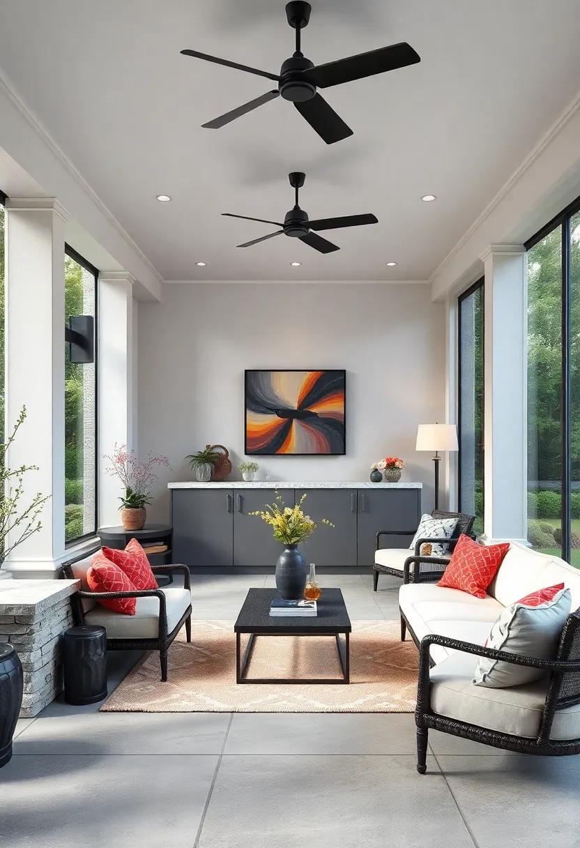 Step into a world where simplicity meets sophistication with a monochrome palette that ties the entire space together effortlessly. Imagine a screened porch transformed into a chic retreat where sleek surfaces reflect natural light, creating an airy ambiance that invites relaxation. The bar area features minimalist cabinetry finished in matte black contrasted by glossy white countertops, forming a striking visual balance. Accents of stainless steel hardware and glassware add a polished touch without overwhelming the senses, ensuring the design remains clean and uncluttered.
