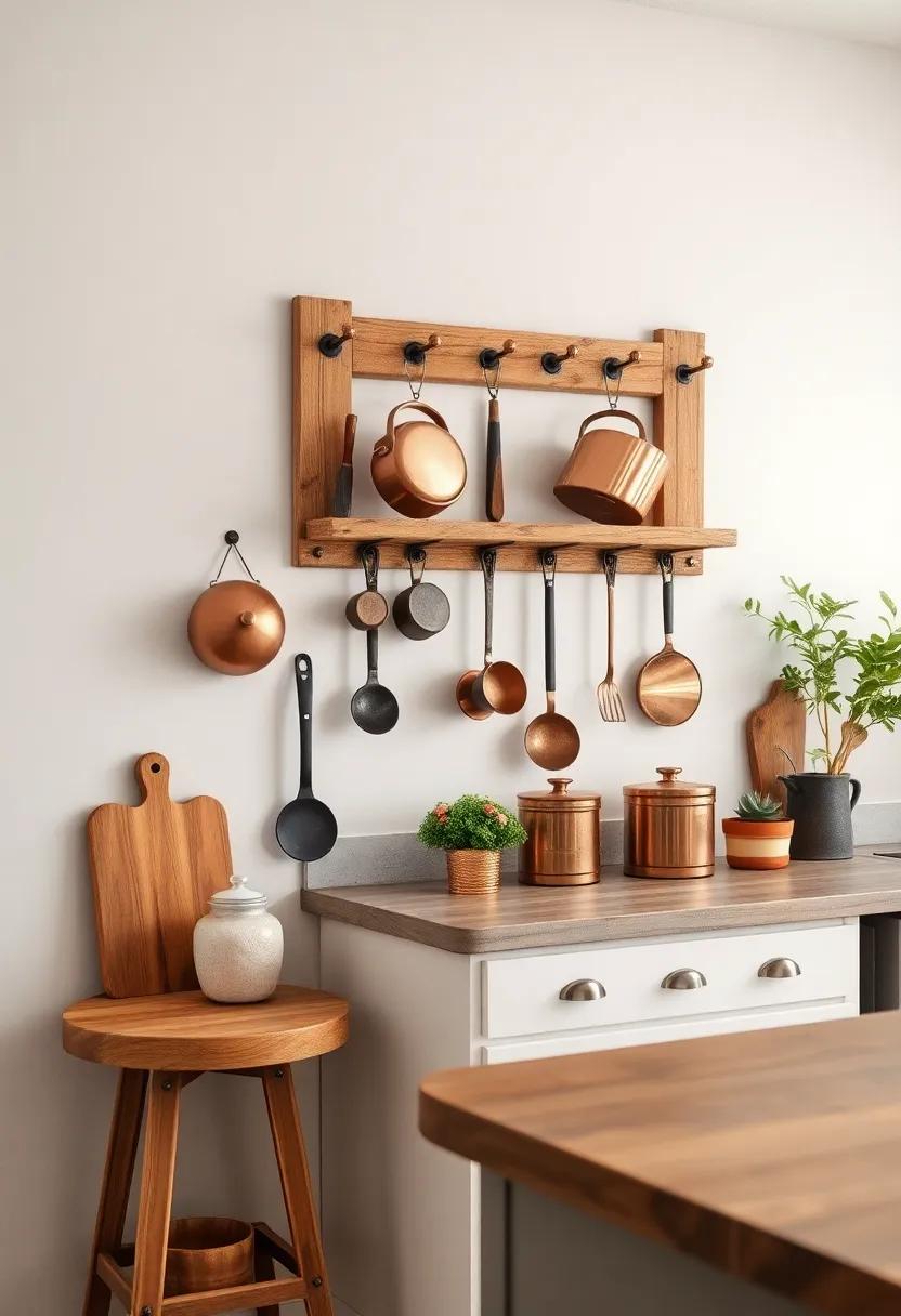 Transform a bare kitchen wall into a functional art piece by integrating rustic wooden wall hooks. These hooks offer more than storage-they create a warm, inviting ambiance that highlights your kitchen’s character. Perfect for hanging copper pots, their rich tones and natural patina bring an organic feel that complements both modern and vintage kitchens. Pair them with vintage kitchen utensils to add a nostalgic touch, turning everyday tools into eye-catching decor that tells a story.