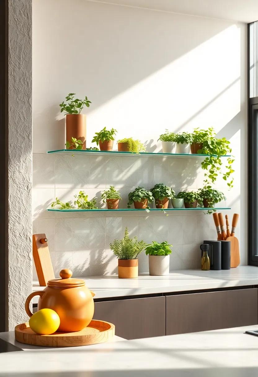 Elegant Floating Glass Shelves Holding Herb Gardens Against a Sunlit Tile Backsplash
