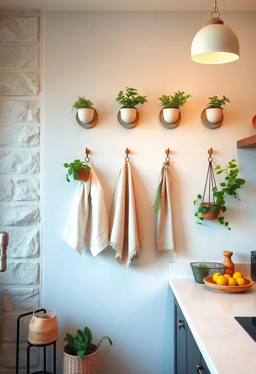 Beyond towels, these hooks double as supports for hanging mini gardens, introducing a fresh botanical element that livens up the kitchen atmosphere. Imagine delicate ceramic pots cradled on hanging macramé holders, with herbs or trailing succulents thriving just within reach. This combination encourages an eco-friendly kitchen vibe and a connection to nature, while the symmetry of the hooks ensures the display remains visually harmonious. Incorporate this clever setup to make your kitchen not only a place for cooking but a gallery of personalized artistry.