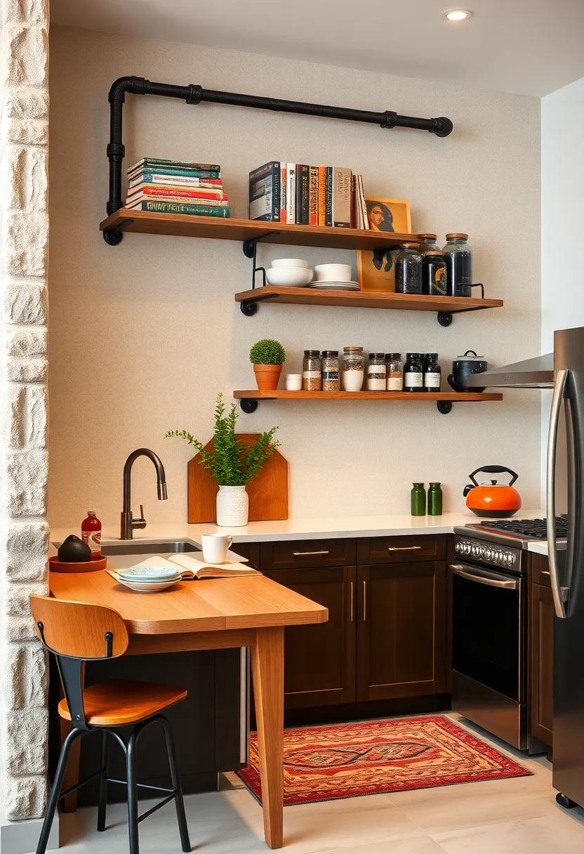 Utilizing industrial pipe shelves turns a small kitchen wall into a stylish storage haven, perfectly balancing function with vintage charm. This rugged shelving showcases eclectic collections of retro cookbooks that bring nostalgic vibes and a pop of color, while antique spice jars add character with their timeless shapes and faded labels. The open shelves keep items within easy reach, encouraging cooks to experiment with new recipes and flavors without sacrificing an inch of precious counter space.
