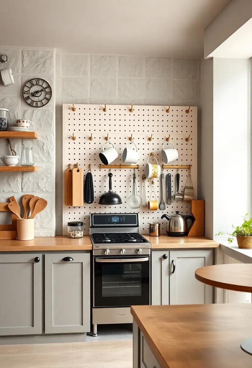 Pastel Painted Pegboard Featuring Hanging Mugs and Kitchen Gadgets for Organized Charm