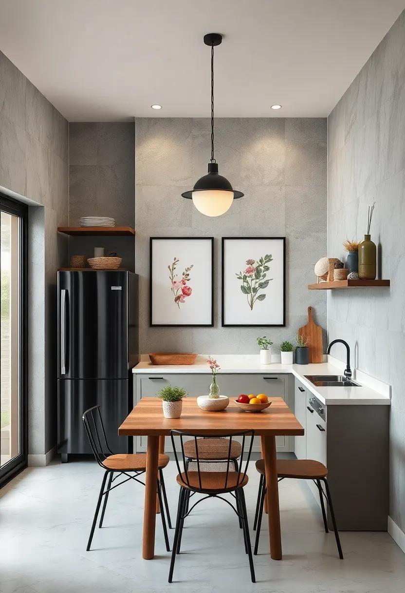 Elevate your compact kitchen by incorporating minimalist black metal frames that showcase delicate botanical prints. These sleek frames not only save precious wall space but also introduce an elegant contrast, highlighting the crisp greens and soft earth tones of plants. Their slender profiles create an airy, uncluttered look, making the room feel larger while bringing a touch of nature’s serenity indoors. The interplay of black metal against natural motifs bridges modern industrial style with organic warmth, perfect for creating a balanced and inviting cooking area.