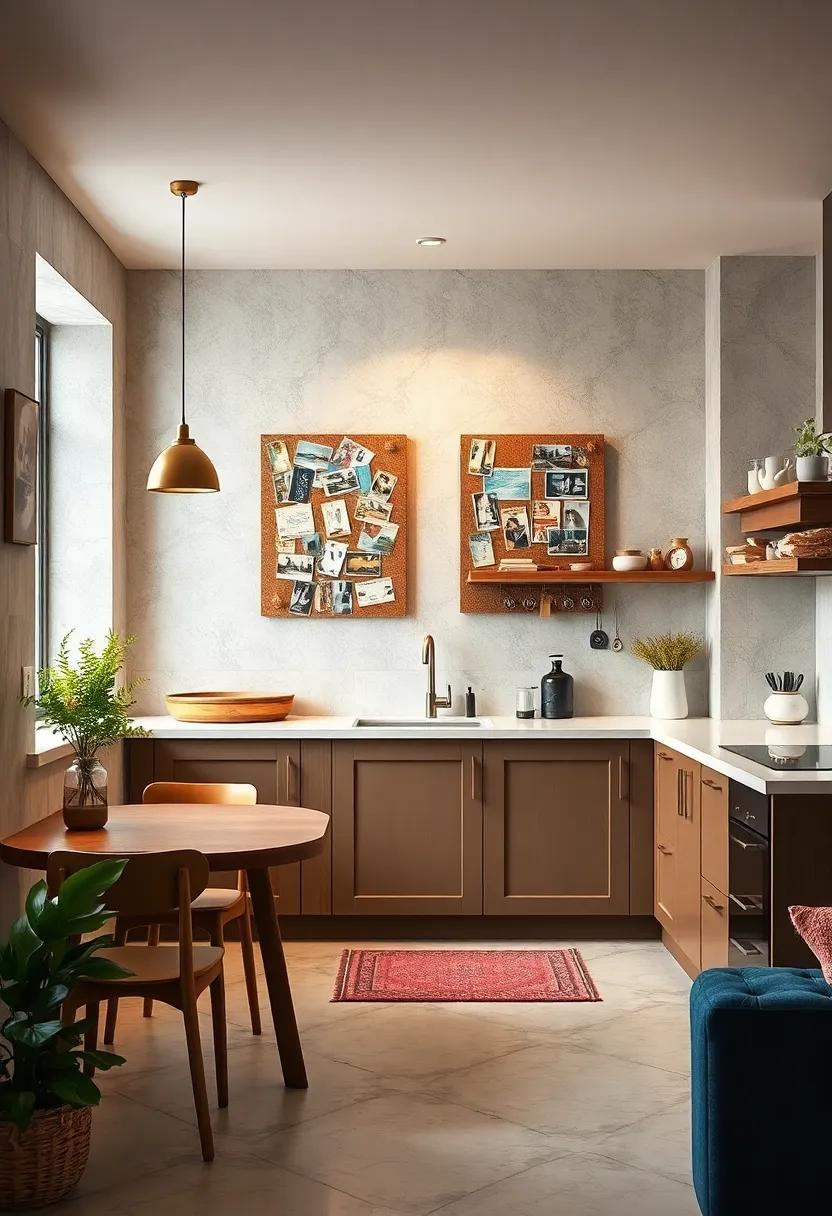 Transform your kitchen walls into a nostalgic gallery by incorporating natural cork boards adorned with artistic collages of vintage recipe clippings and postcards. This approach not only adds a unique visual interest but also infuses charm and personality into your cooking space. The natural textures of cork provide a warm, organic backdrop that complements the aged paper and faded inks of vintage prints, creating a captivating mix of rustic and retro vibes. Use colorful push pins or tiny clips to attach the elements, allowing for easy updates and seasonal swaps that keep your kitchen décor fresh and engaging.