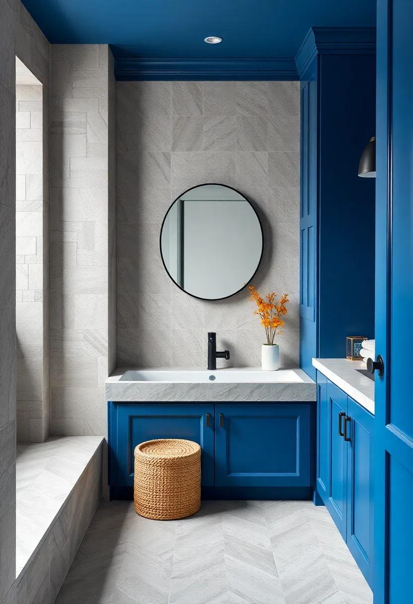Transforming a bathroom into a sanctuary that blends boldness and coziness is effortlessly achieved with deep ocean blue cabinets paired with matte black hardware. This striking color combination evokes a sense of depth and sophistication, while the matte finish on the fixtures adds a modern edge without overpowering the space. The rich blue brings a unique, calming vibe reminiscent of serene ocean waters, making the bathroom feel both refreshing and intimate. To enhance the ambiance, soft lighting and natural textures like woven baskets or wooden accent shelves work beautifully alongside these strong design elements.