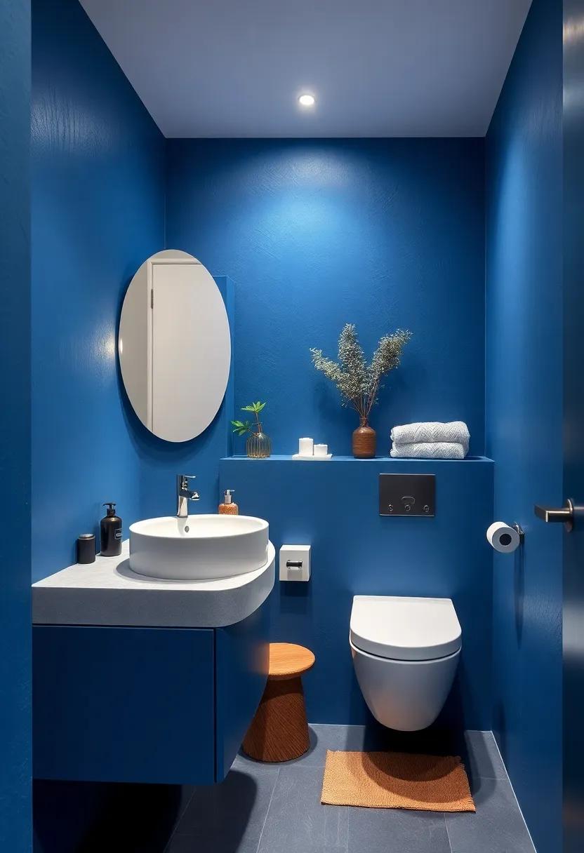 Combining bold cobalt blue walls with warm wooden flooring creates a dynamic interplay of cool and cozy elements, transforming a small bathroom into a visually stimulating retreat. The deep blue hue adds depth and sophistication, making the walls a striking focal point without overwhelming the space. Meanwhile, natural wood tones inject warmth and texture, balancing the intensity of the blue and inviting a sense of comfort. This pairing invites personal expression while maintaining an elegant simplicity that complements various décor styles, from modern minimalist to rustic chic.