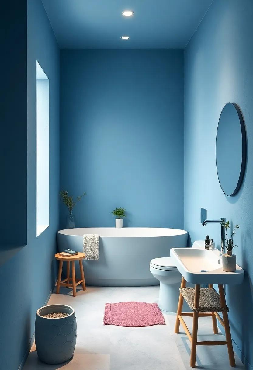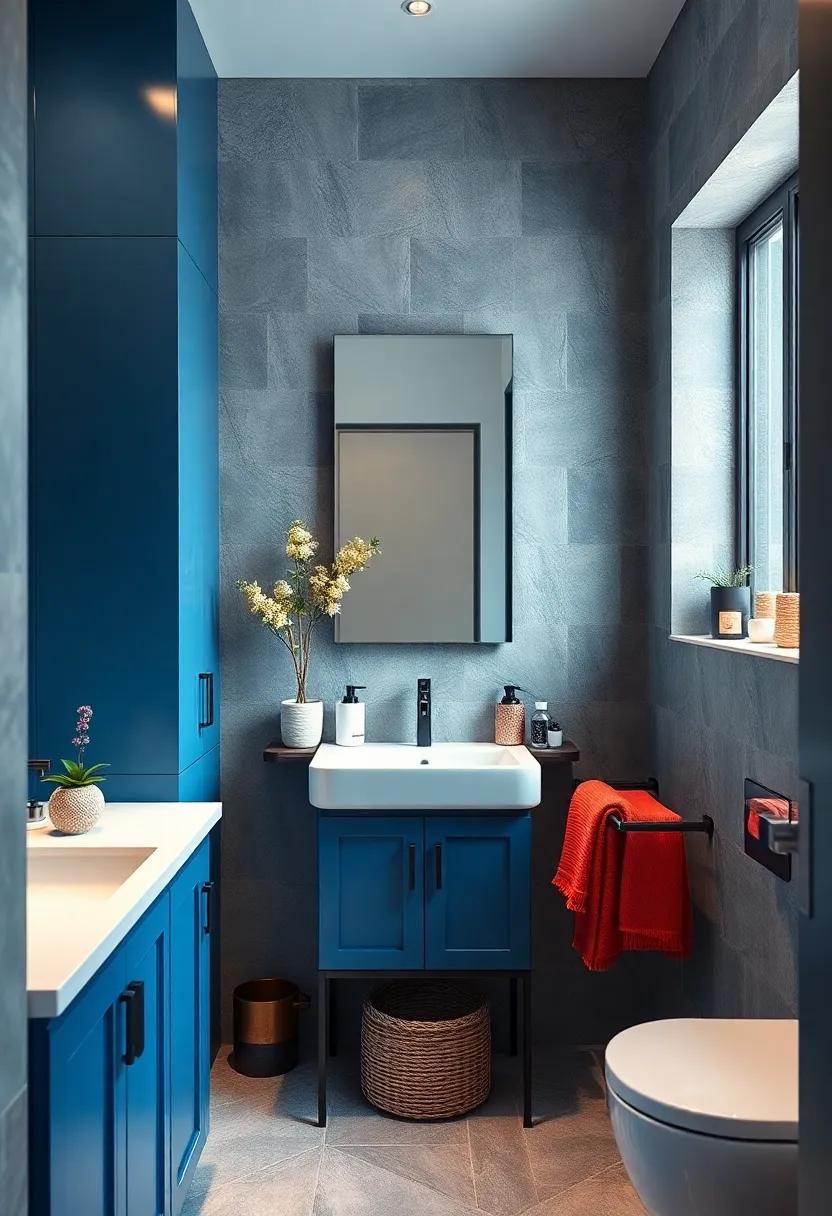 In this daring design approach, bold blue concrete walls take center stage, creating a striking visual statement that breathes life into even the smallest bathroom spaces. The raw, textured surfaces evoke an urban feel that is both edgy and sophisticated. Combining these walls with industrial elements – think exposed pipework, matte black fixtures, and rugged metal shelving – results in a space that exudes both functionality and style. The concrete’s cool undertone balances the warmth of wooden accents or soft textiles, bringing harmony to a bold palette.