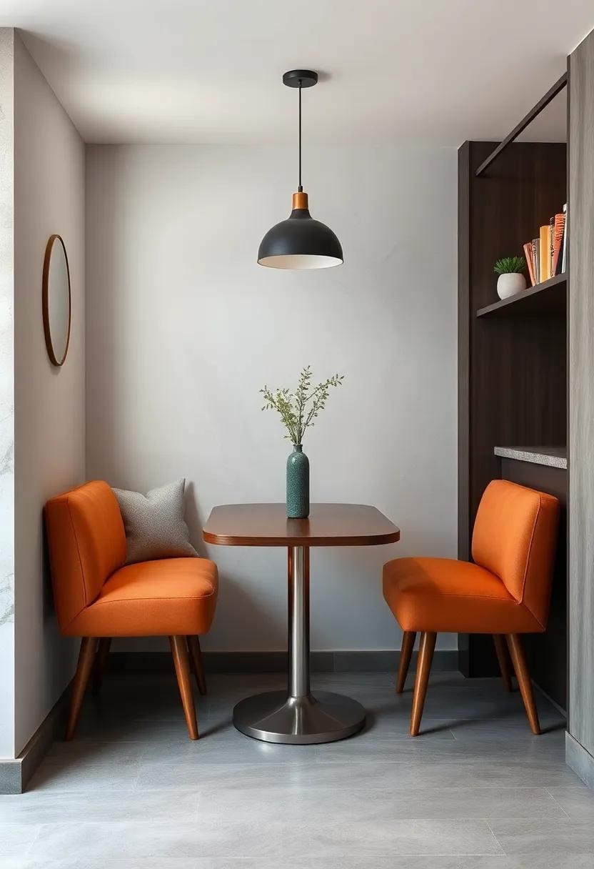 Inject a burst of color and character into your compact kitchen nook by choosing tables inspired by mid-century retro designs. These distinctive tables often feature clean lines paired with warm wood tones or glossy finishes, creating a timeless yet striking look. Complementing them with vibrant upholstered seats not only adds a cozy, inviting vibe but also serves as a playful focal point, making even the smallest spaces feel lively and welcoming. Use bold hues such as teal, mustard yellow, or burnt orange to contrast subtly with neutral walls or cabinetry, transforming everyday meal moments into a delightful visual experience.