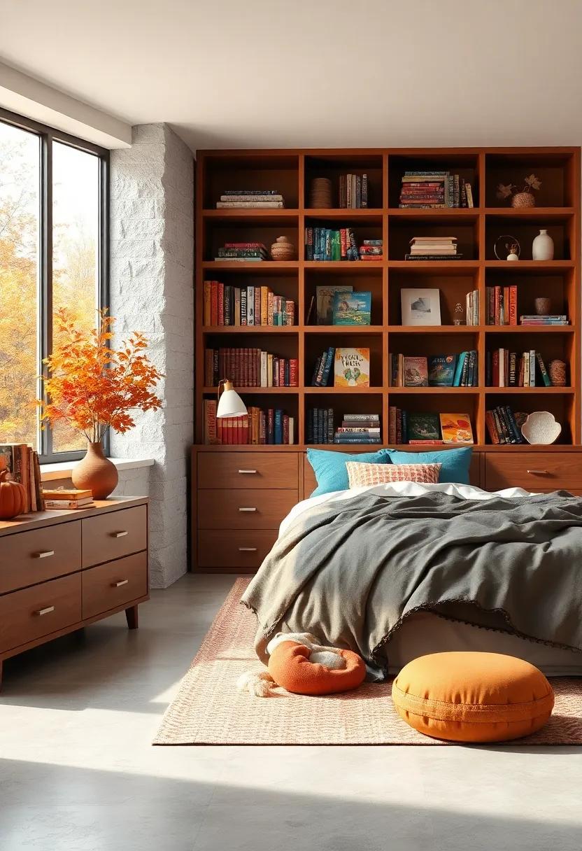 - Natural Wooden Shelves: To hold autumn-themed books and décor, reinforcing the rustic motif.