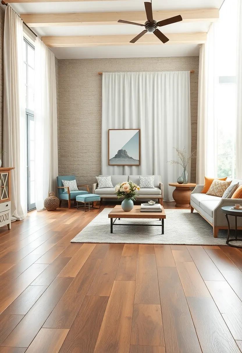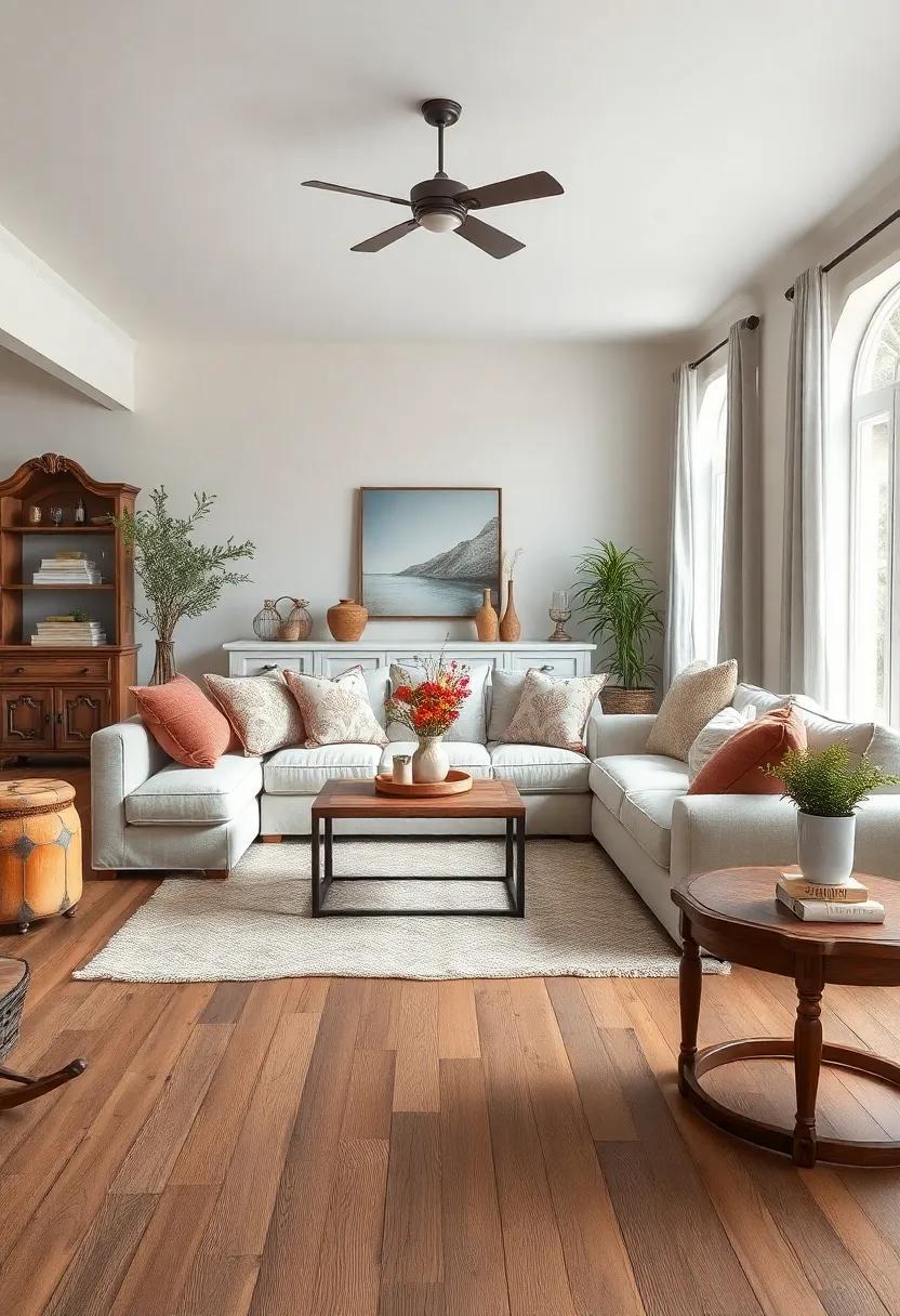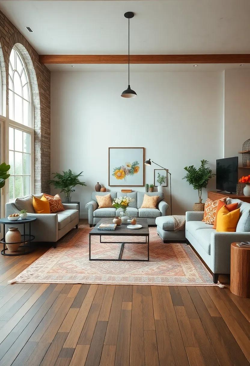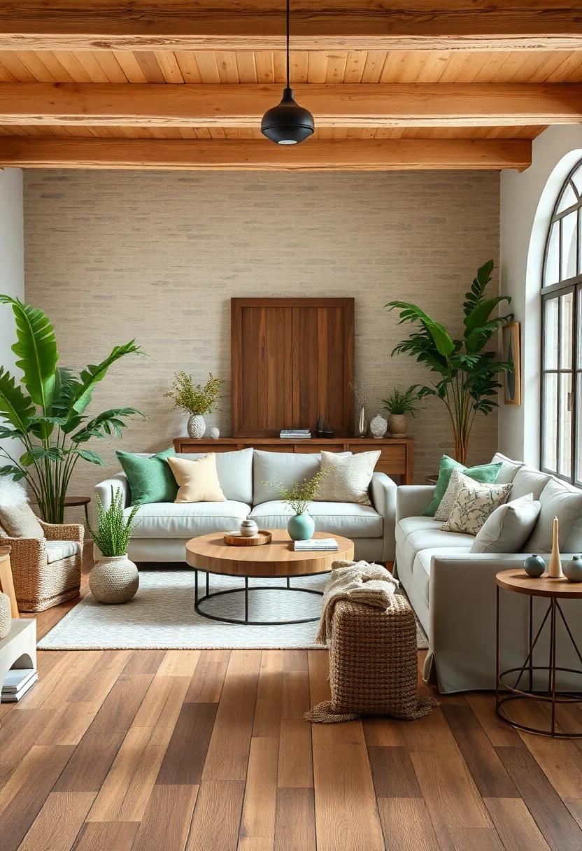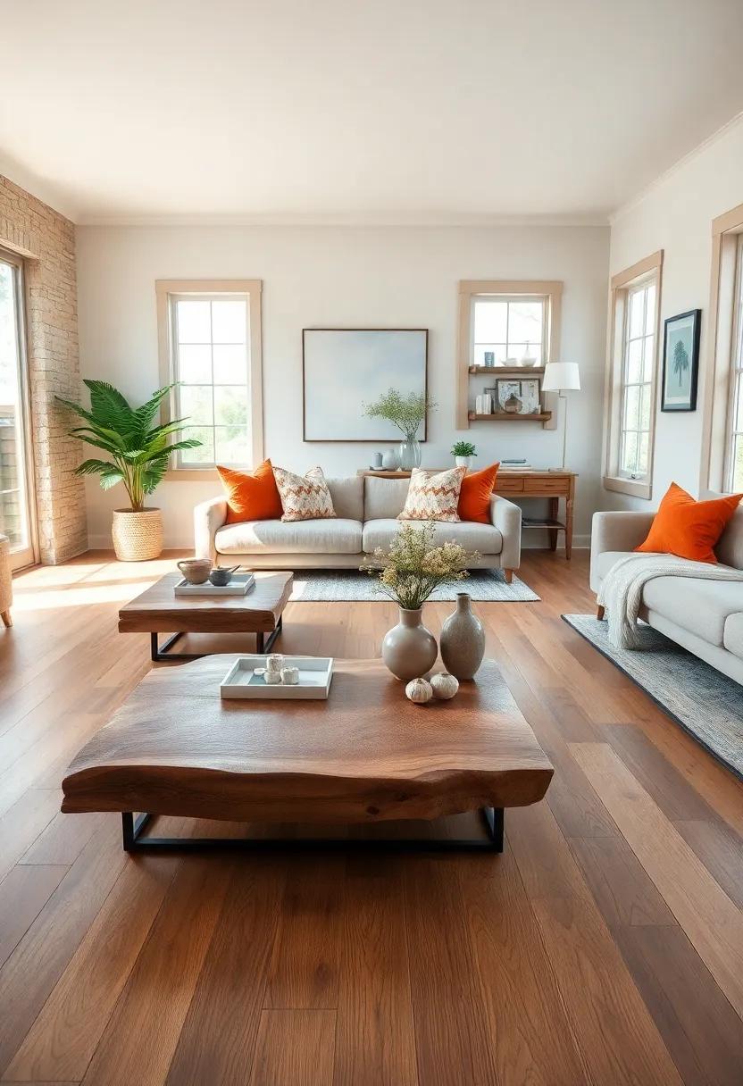 This curated combination enhances the welcoming charm of rustic flooring, turning your living room into a sanctuary where style meets cozy practicality.