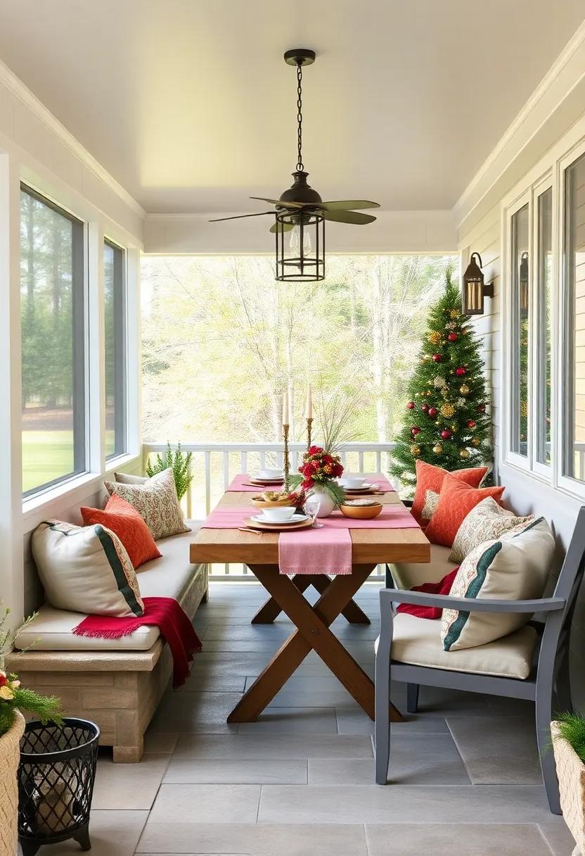 Transform your screened porch into a warm and inviting haven this holiday season by incorporating plush, cozy bench seating accentuated with textured throws in rich, seasonal hues. Imagine sinking into a soft, knitted blanket as the crisp winter air brushes past, while the built-in benches offer ample, comfortable space for family and guests to gather close. Layered with cushions and a mix of soft furs or velvets, the seating arrangement becomes both a functional and aesthetic delight, inviting lingering conversations and joyous laughter around the table.