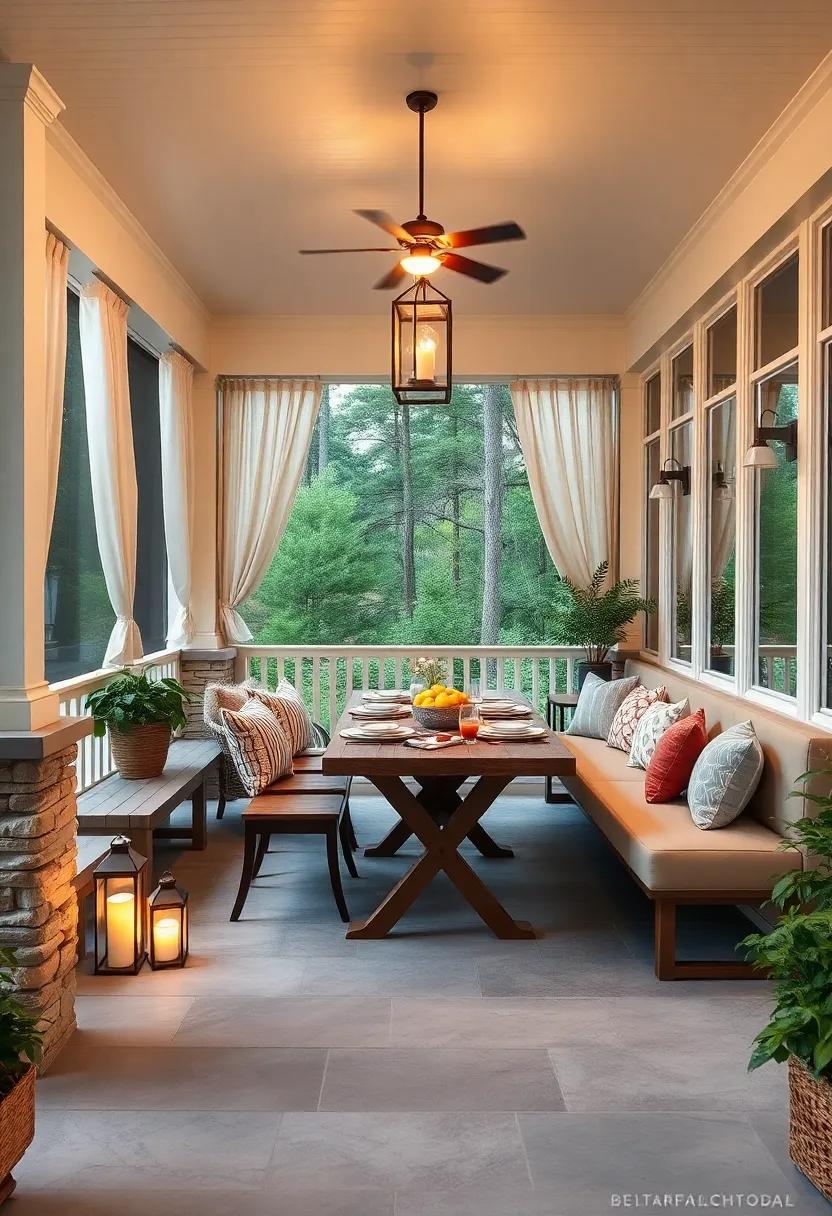 Cozy Screened Porch Dining Area Featuring Soft Lighting and Earthy Tones for a Warm Ambiance