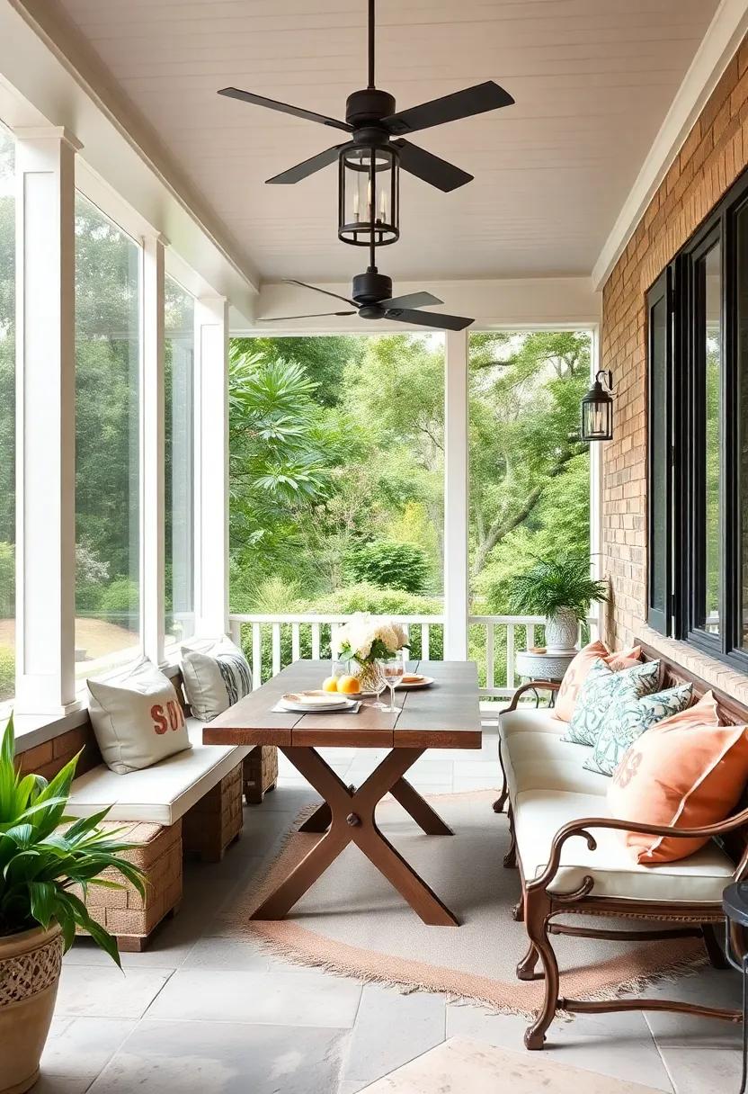 Cozy Screened Porch Dining: Stylish Meals with Built-In Bench Seating