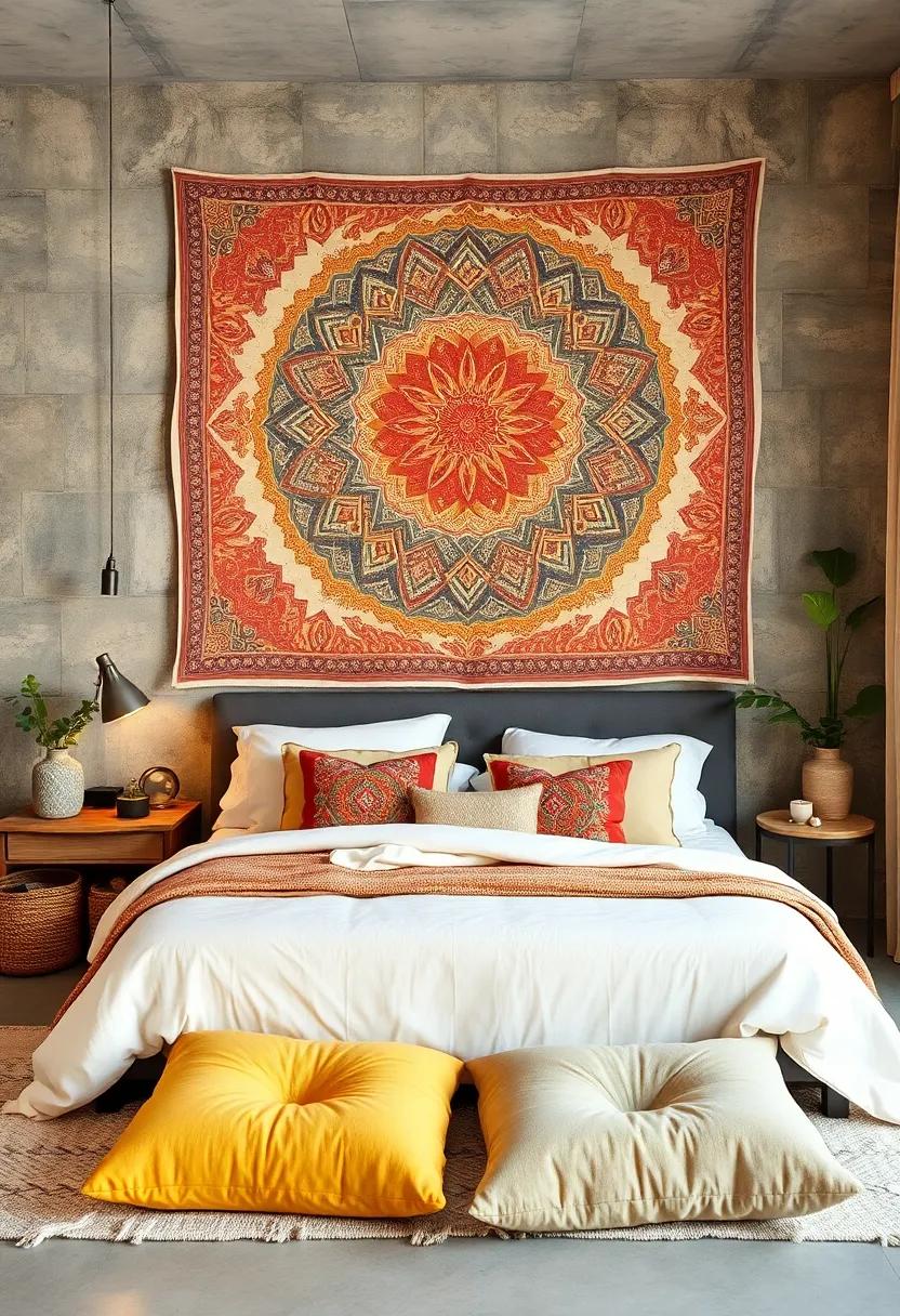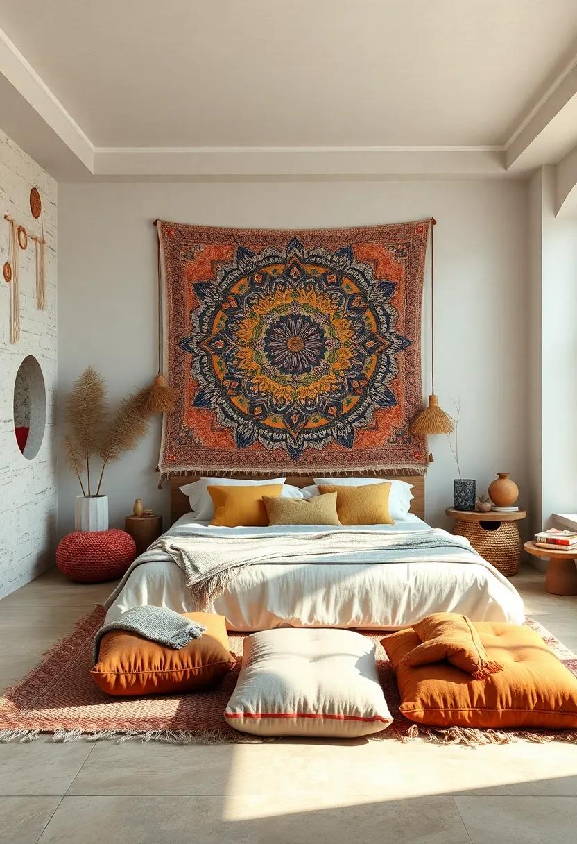 Creating a Warm and Inviting Bohemian Bedroom with Intricate Tapestry Wall Art and Plush Floor Cushions