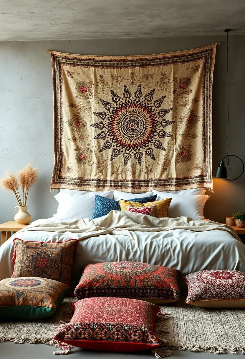 Mixing Global Patterns in a Cozy Bedroom Scene with Bohemian Tapestry Backdrop and Eclectic Floor Cushions