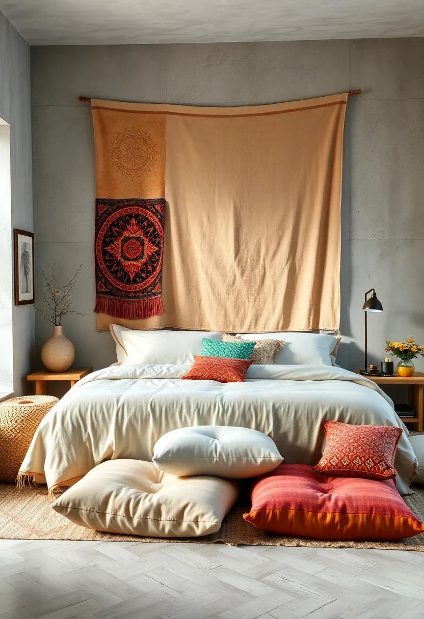 Transforming a bedroom into a tranquil retreat often begins by embracing textures and layers that evoke warmth and calm. Soft tapestries, expertly draped above a carefully arranged cluster of patterned floor cushions, invite relaxation and conversation alike. The gentle folds of fabric create a soothing canopy that visually softens the space, while the cushions introduce vibrant colors and cultural flair. This tactile harmony-where plush meets fabric-naturally cultivates a serene ambiance, perfect for unwinding after a busy day or for quiet moments of reflection.
