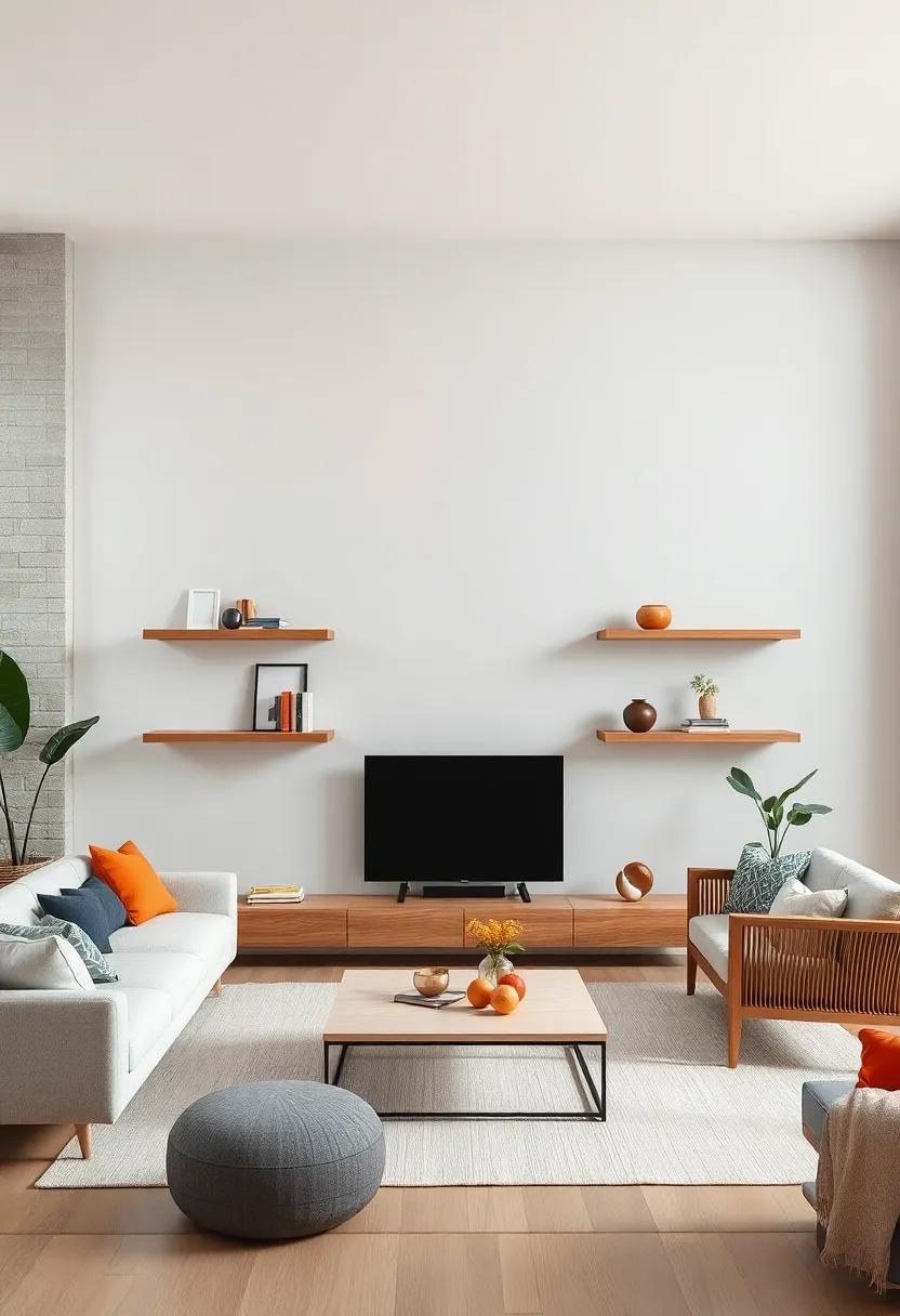 Combining natural wood floating shelves with pristine white walls creates an inviting balance between warmth and modern simplicity. The wood’s organic grains and hues introduce a subtle texture that contrasts beautifully against clean, white backdrops, enhancing the room’s depth without overwhelming it. This pairing naturally draws the eye upward, offering a spacious feeling that elevates the entire living area’s aesthetic. To maximize this effect, keep shelf décor minimal-think succulent plants, monochrome ceramics, and a handful of curated books-all contributing to an uncluttered yet personalized vibe.