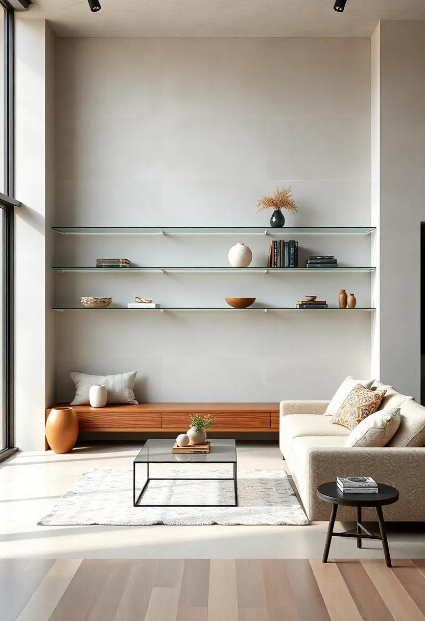 Glass Shelves Emphasizing Transparency and Lightness In A Modern Living Room Setting